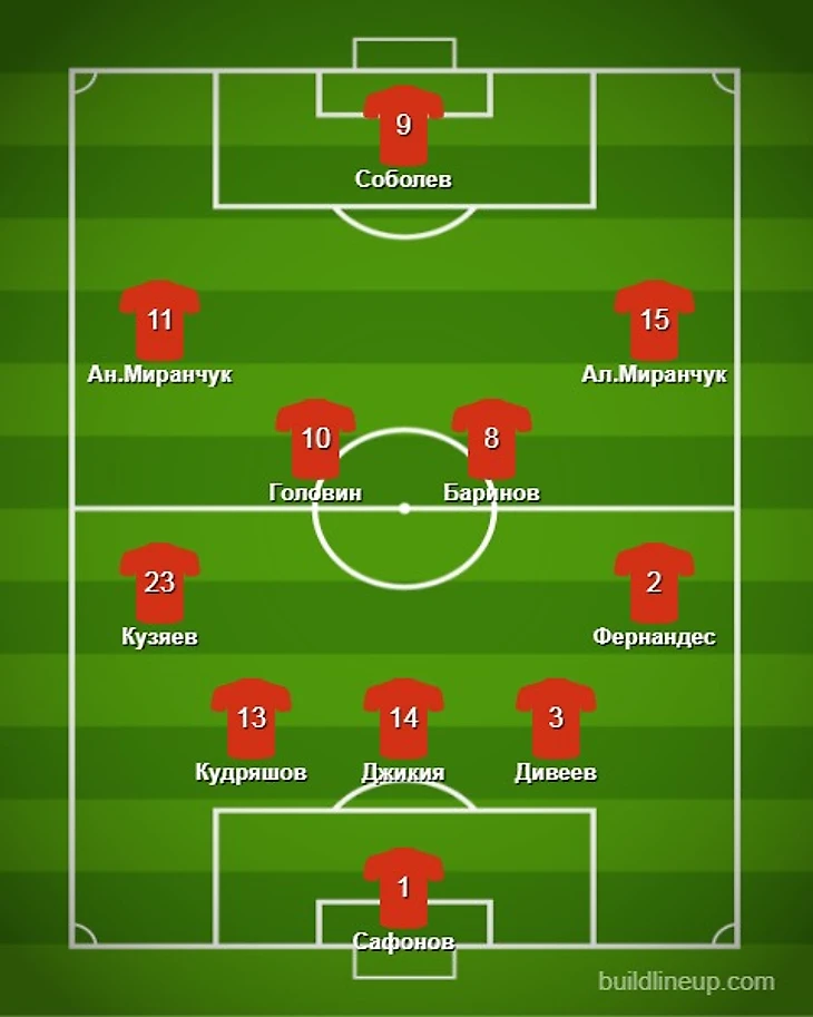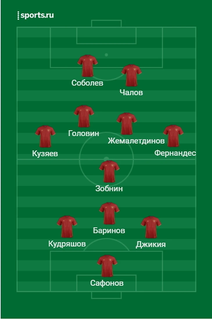 Здесь мы сделаем невероятное и используем одну из немногочисленных попыток инноваций от Черчесова,а именно выдвинем чуть вперёд двух центральных защитников Дмитрия Баринова,как было в мачте с Болгарией, эта идея кажется мне интересной. Он будет связующим звеном между центральным полузащитником Зобниным и двумя центральными,а также иметь возможности протаскивать мяч вперёд когда соперник слишком прижимается. В этой схеме много передач через центр,важно держать приличный темп и мало ошибаться.В полузащите важная роль у Жематетдинова,Николич довольно интересно использует Рифата в Локомотиве,мне нравится как он находит зоны,учавствует в обыгрышах,иногда обостряет индивидуальным проходом. Данная роль энергозатратна и во втором тайме есть опция замены на Алексея Миранчука или Арсена Захаряна.Головин в данной расстановке выступает довольно высоко и близко к нападающим,они с Жемалетдиновым должны запутывать оборону соперника. В атаке тандем нападающих : Соболев и Чалов. Фёдор Чалов мне всегда импонировал,это умный футболист с интересными решениями,новый тренер обязательно должен его использовать.Есть также вариант использовать пару Смолов-Чалов, но оба нападающих иногда выпадают из игры и превращаются в невидимок,так что лучше не рисковать и выставить Фёдора именно с Соболевым,а во втором тайме уже выпустить Смолова.
