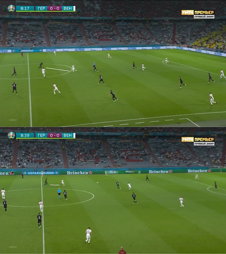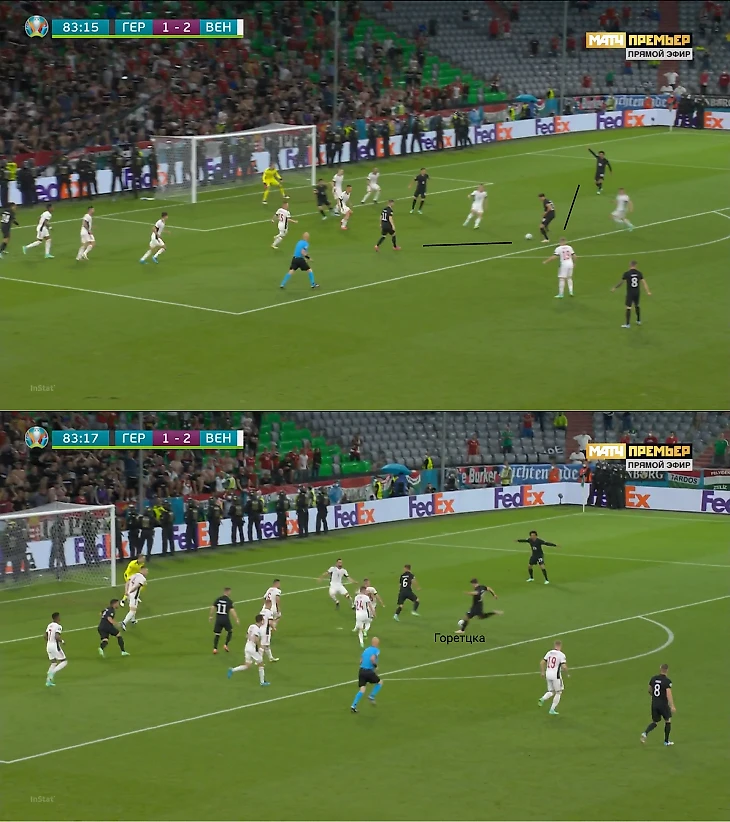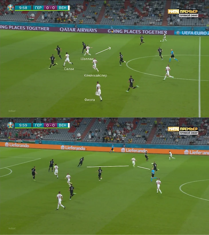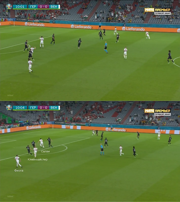 Плюс ситуацию дополняли Фиола и Кляйнхайслер. По сути, они никак не повлияли на эпизод (хотя в определенный момент Фиола выигрывал позицию у Киммиха, видно на скрине выше), но у них был шанс на атаку вторым темпом. В итоге Салаи выиграл позицию у Хуммельса и Венгрия забила первым же ударом.
