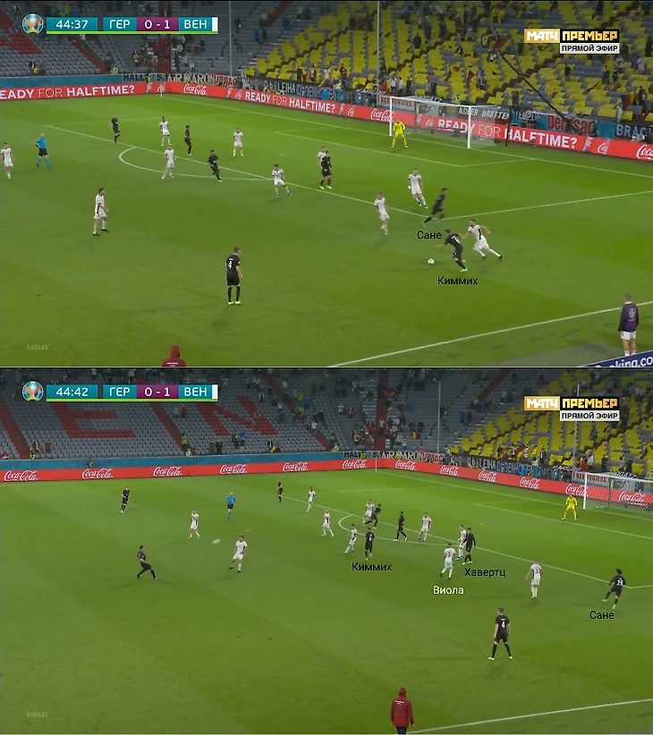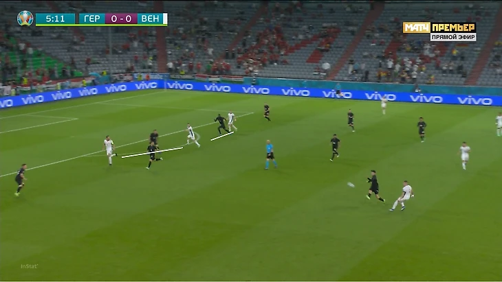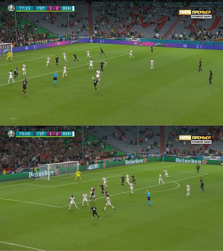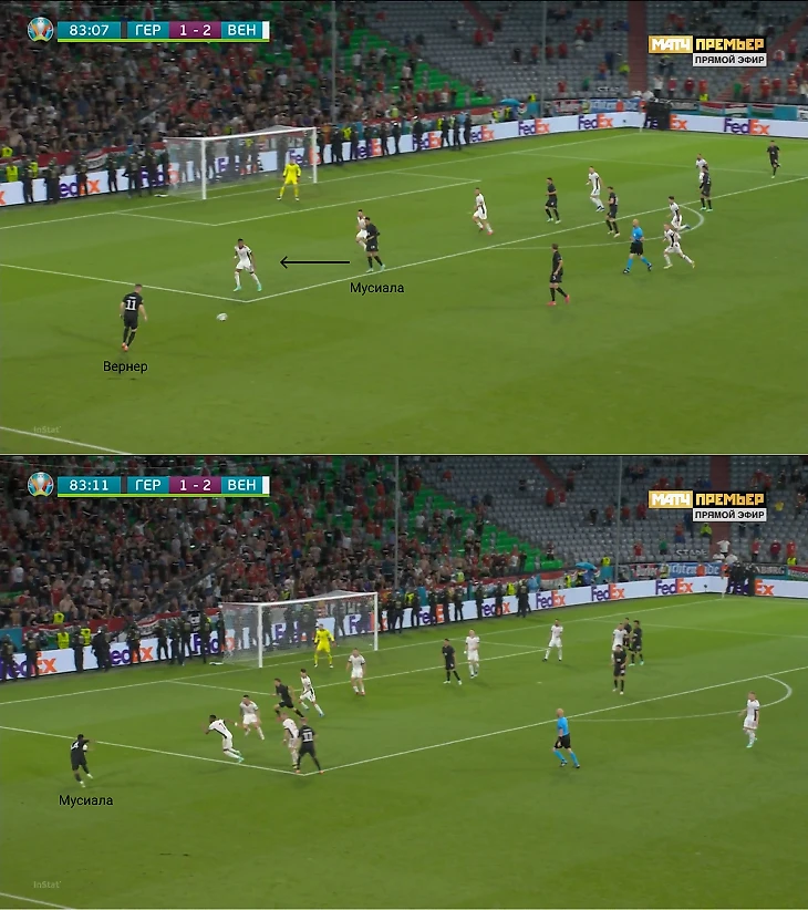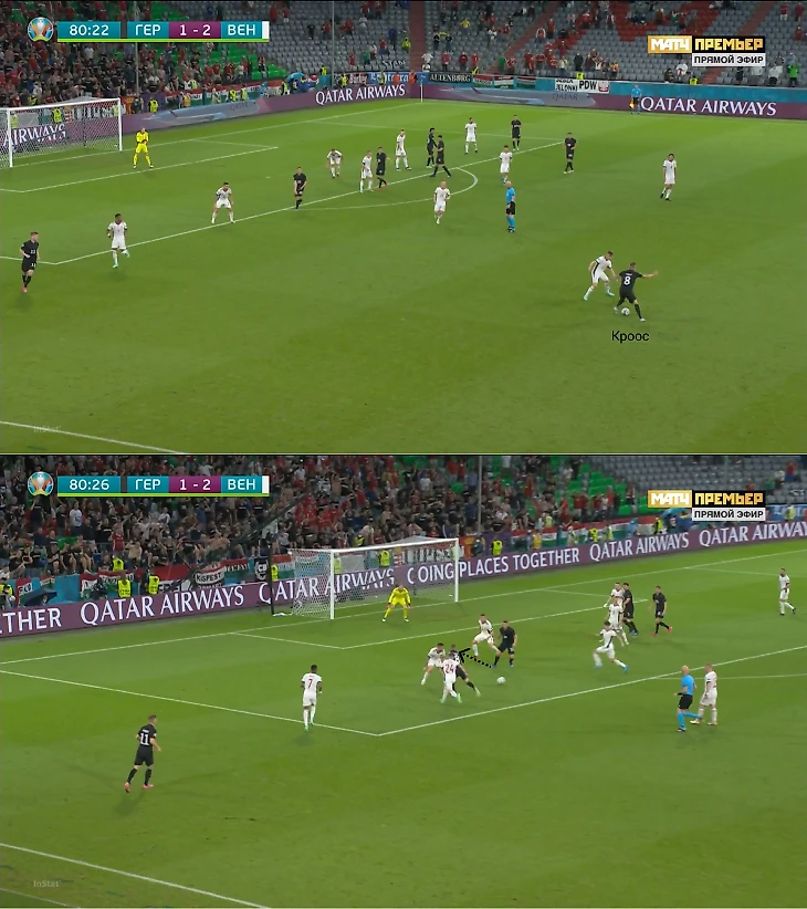 Количество немцев в штрафной зарешало в голевой атаке. Германия долго пасовалась, никак не находя возможностей под проникающую передачу. Кроос грамотно перевел мяч налево, где Вернер находился 1-в-1 с Него. Ему помог Мусиала: выбежал из штрафной и открылся под передачу. Затем Джамал крутанул Него и отрезал передачей нескольких венгров.