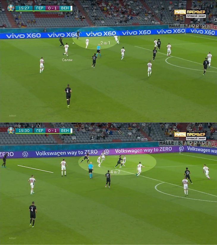 Венгрия глубоко садилась в 5-3-2. В первой фазе Германия имела преимущество 3-в-2, а когда венгры садились еще глубже – даже 4-в-2 (к тройке защитников добавлялся Кроос). Обычно во время таких перекатов к одному из крайних центральных защитников выбрасывался Шефер или Кляйнхайслер. Но после гола ситуация совсем радикализовалась: теперь выдвижения полузащитников страховал Салаи (Шаллаи делал это чуть реже). Из-за этого у Германии стало еще меньше пространства: в центре Гюндоган почти не находил пространство (за исключением одного эпизода), а на флангах Венгры устраивали численное превосходство.