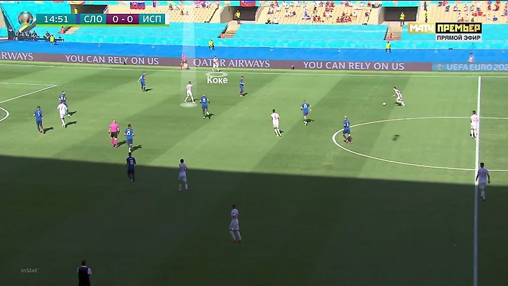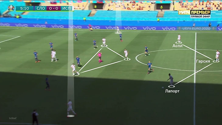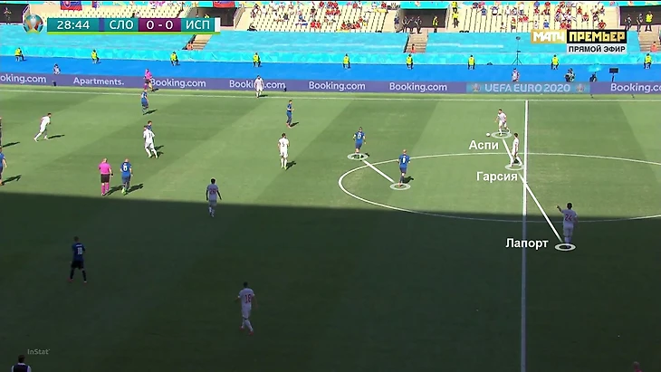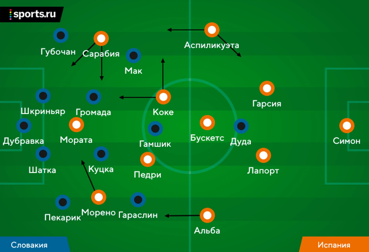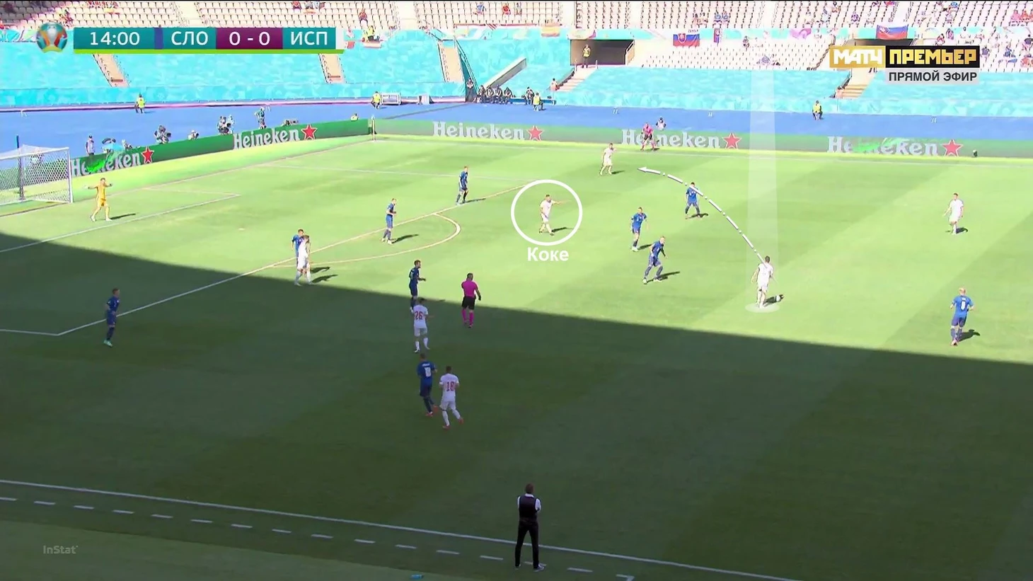 Такой вариант подходил качествам игроков. Аспиликуэта играет в схожей роли в «Челси», а Лапорту намного удобнее находиться ближе к левому флангу. Но прием подходил и под конкретного соперника – у Словакии без мяча была схема 4-4-2. Это приводило к соотношению 3-в-2 с преимуществом Испании в первой стадии.