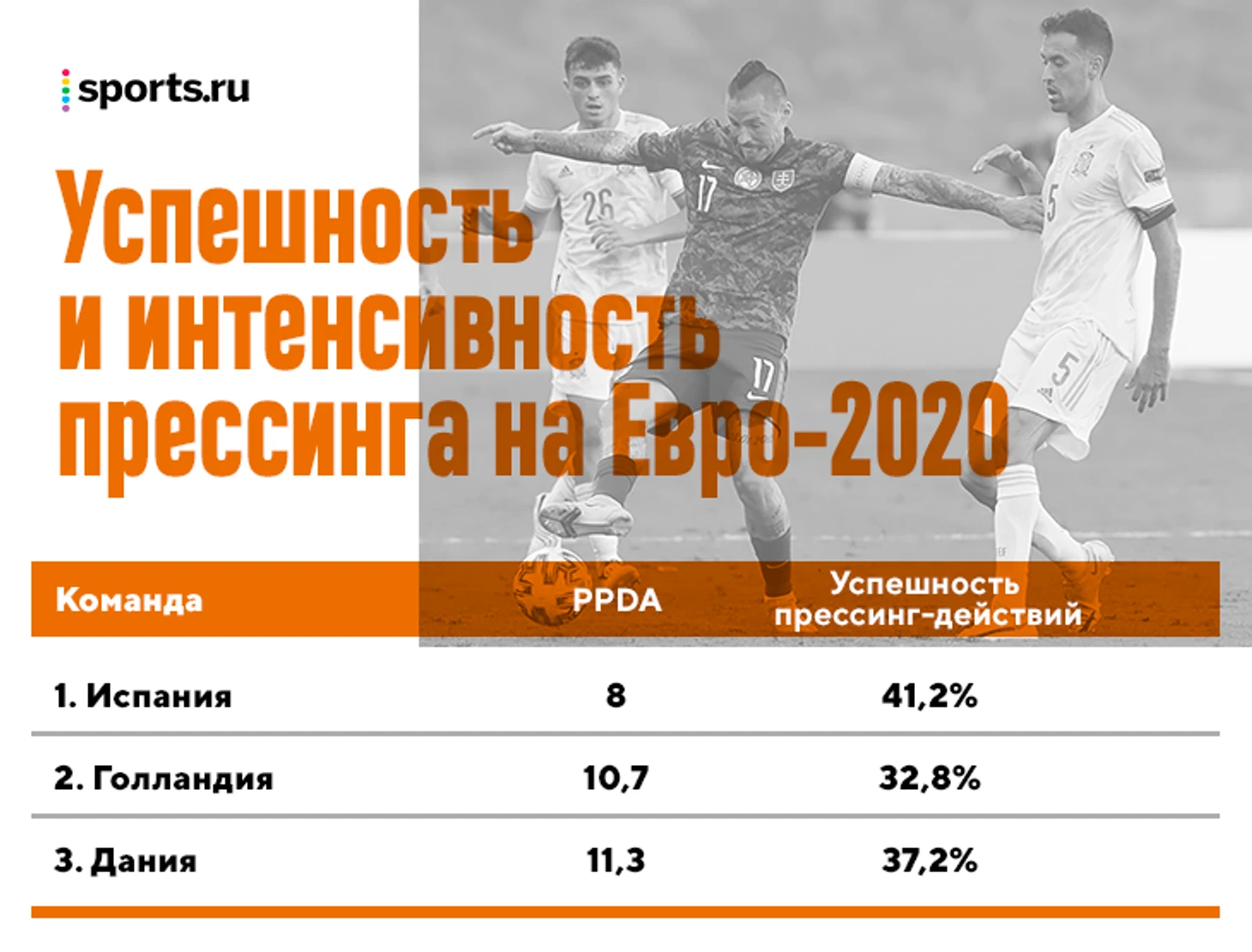 И по интенсивности давления, и по эффективности прессинг-действия испанцы на уверенном первом месте. Вероятно, нужно сделать скидку на группу. Не было команды, которая по-настоящему качественно разыгрывает коротко и могла бы проверить прессинг в полной мере. Но соперников, с которыми испанцы встречались, они по части прессинга просто смяли.