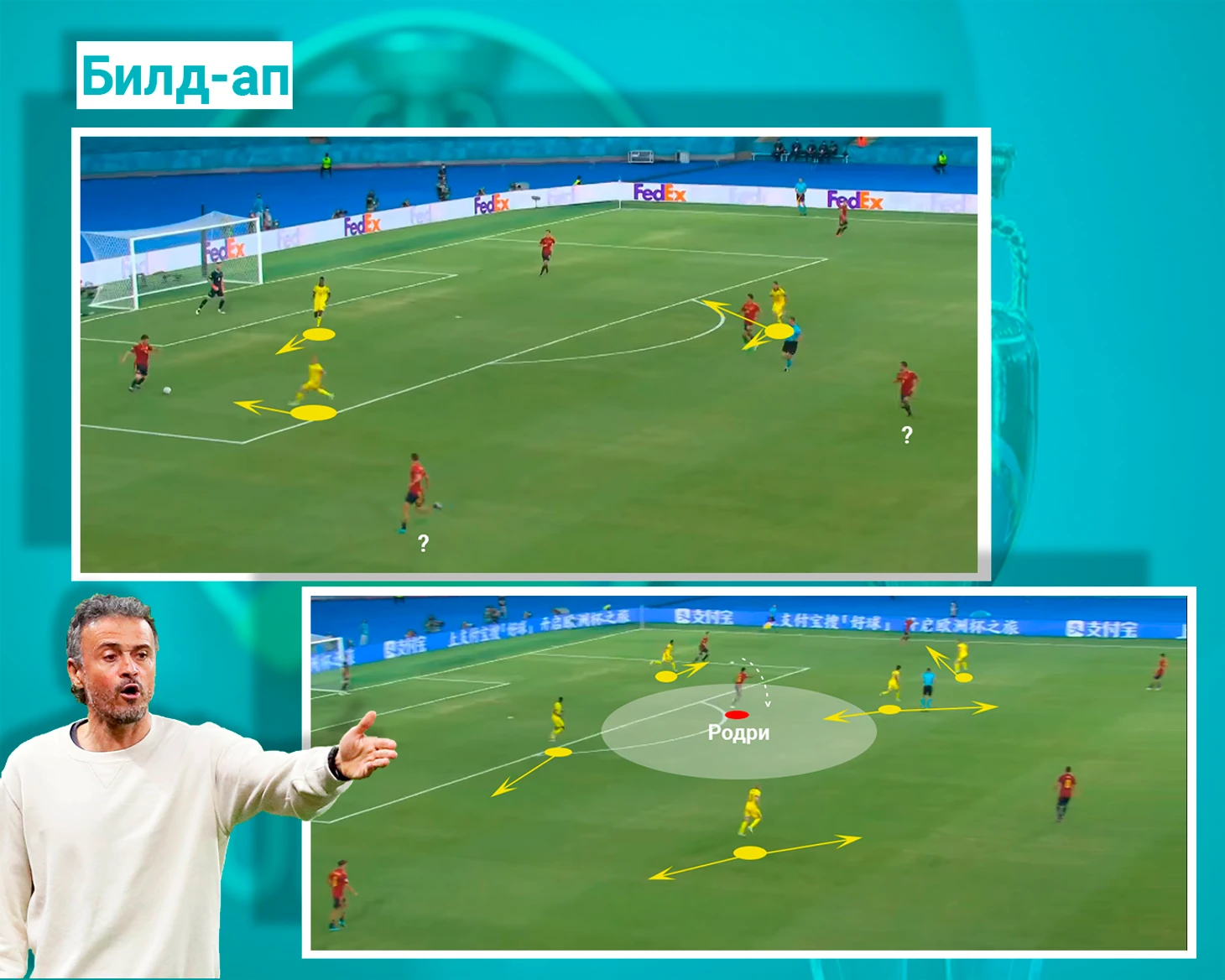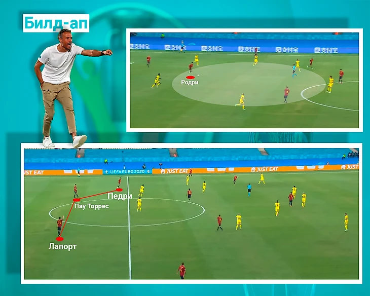 Билд-ап. За счёт хорошо продуманной структуры для выхода из под прессинга Испанцы с легкостью справлялись с редким, но всё же прессингом Шведов. Фурия Роха всегда старалась найти лишнего игрока в центре, им часто были Родри и Коке, а на флангах Альба и Маркос Льоренте. Сильно восхвалять Испанию здесь не приходиться, т.к. прессинг соперников был не самым слаженным.