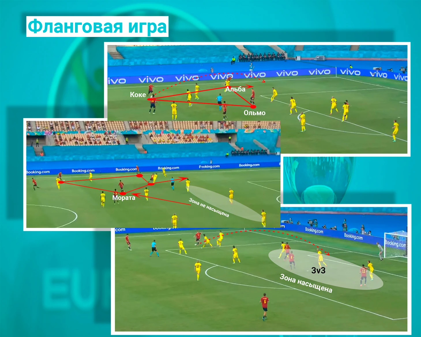 Коке успевал и на другом фланге, но это довольно редкое событие. Чаще всего тругольник левого фланга состоял из Педри, Жорди Альбы и Ольмо. Здесь игра была с меньшими сменами позиций, но не значит, что она была менее эффективна. Жорди Альба делал фирменные забегания за спину защитникам;главная их особенность - своевременность.(Вадим Лукомский о Жорди Альбе https://www.sports.ru/football/blogs/2935190.html) Ольмо играл скрытого нападающего. Находясь в полуфланге, он часто делал вбегания в штрафную зону. Педри занимал поцизию ближе к центру и награждал передачами Жорди Альбу. Игра сборной Испании напоминает игру Манчестер сити Гвардиолы. Они умудряются перегрузить фланг выдвижением Мораты, при этом не имея игрока в зоне центральных защитников соперника, и Испанцы через несколько секунд уже насыщают штрафную зону сразу тремя игоками.