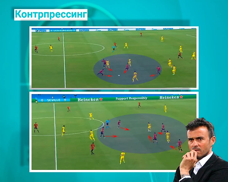 Контрпрессинг Основным инструментом в достижении 85-процентного владения послужил контрпрессинг. Возможно, он был идеальным. Правило 5 секунд,по канонам всё того же Гвардиолы, работало прекрасно. Данное правило заключается в том, что после потери мяча игроки за 5 секунд должны вернуть его под свой контроль. Испанцы проворачивали такое на постоянной основе.