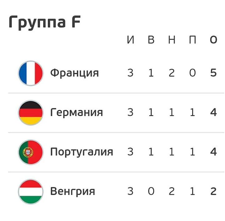 Сборная Венгрии сначала успешно оборонялась в матче с Португалией до 80й минуты, а затем дважды сыграла вничью с чемпионами мира 2018 и чемпионами мира 2014. Стоит отметить, что именно Венгрия открывала счёт в обоих матчах. Выйти из группы они, конечно, не смогли, но не думаю, что болельщики сборной Венгрии были разочарованы выступлением любимой команды. В матчах этой группы было забито 3 автогола, и реализовано 4 пенальти (3 из них, кстати, реализовал Криштиану Роналду, который опять побил какие-то рекорды). Как и ожидалось, все три топ сборные из этой группы вышли в плей офф. Португалия сыграет с Бельгией, Франция со Швейцарией, а Германия с Англией.