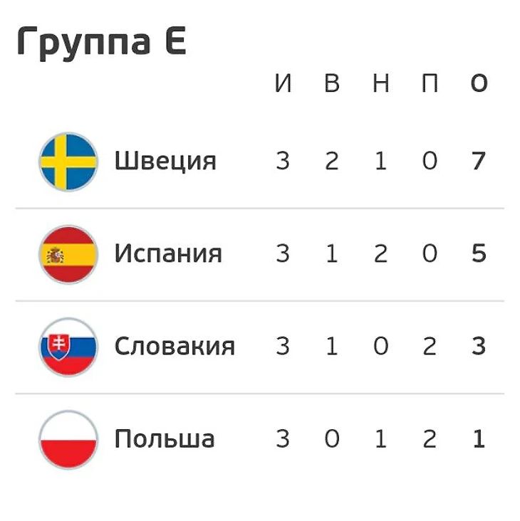 Швеция, сумев удержать нулевую ничью в матче с испанцами, одержала две тяжелейшие победы подряд и заслуженно вышла в плей офф с первого места. Испания провела первые два матча не лучшим образом, сыграв вничью с Польшей и Швецией, но потом отыгралась на Словакии, разгромив её со счётом 5:0. Теперь Швеция сыграет с Украиной, Испания с Хорватией, а Польша и Словакия теперь сыграют только на отборочном турнире ЧМ2022.