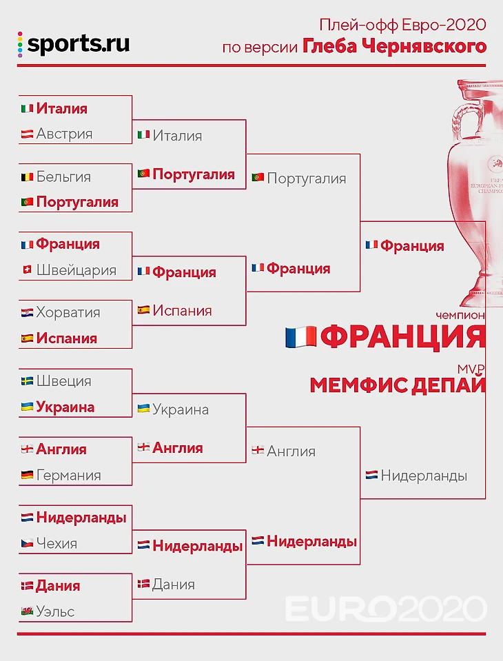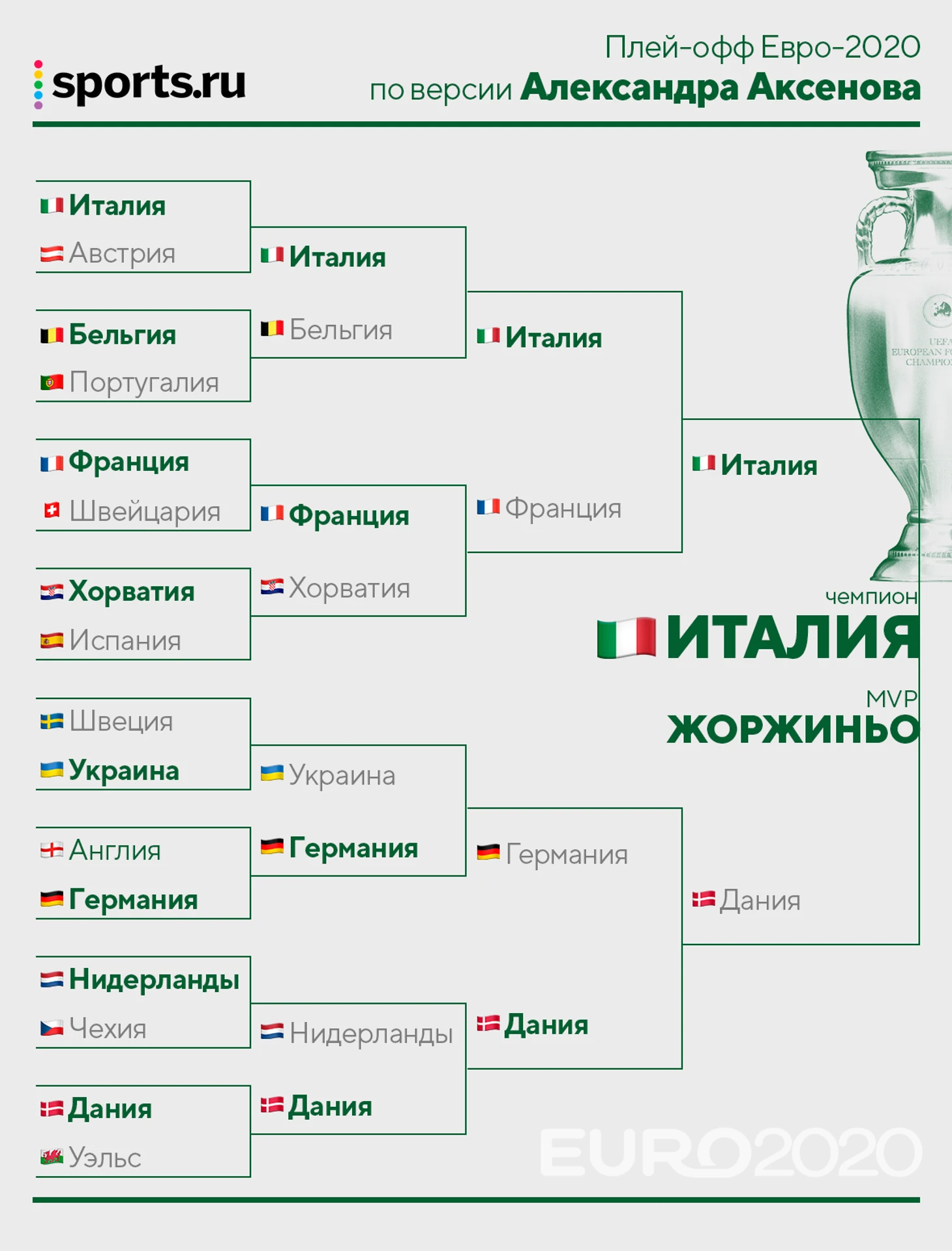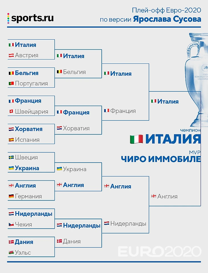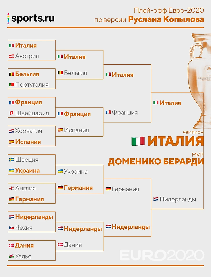 Завтра стартует плей-офф Евро-2020 – кажется, сейчас идеальный момент, чтобы угадать, чем закончится турнир. Авторы Sports.ru врываются с прогнозами сеток, а заодно выбирают чемпиона и лучшего игрока турнира.