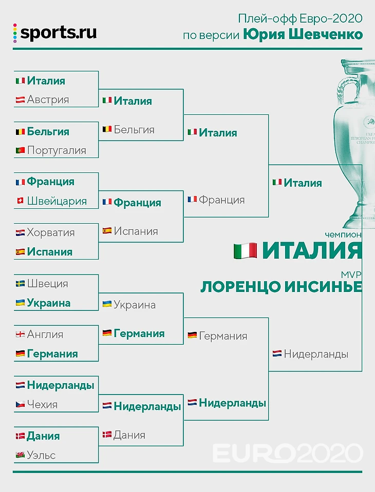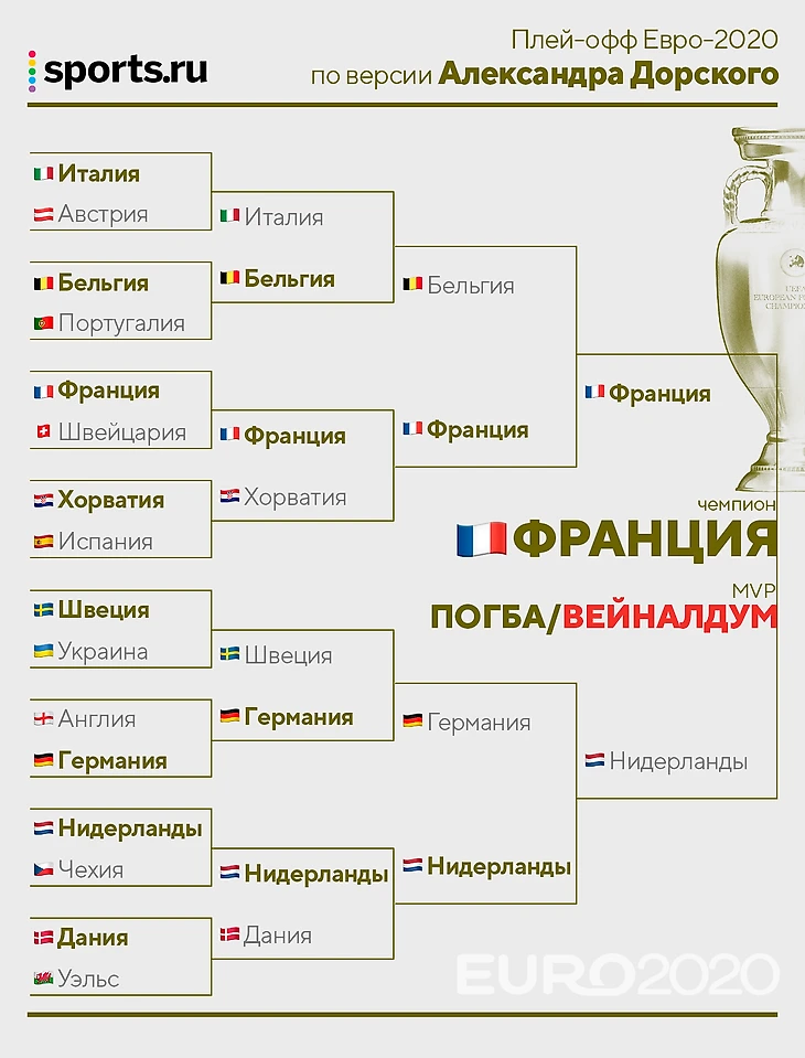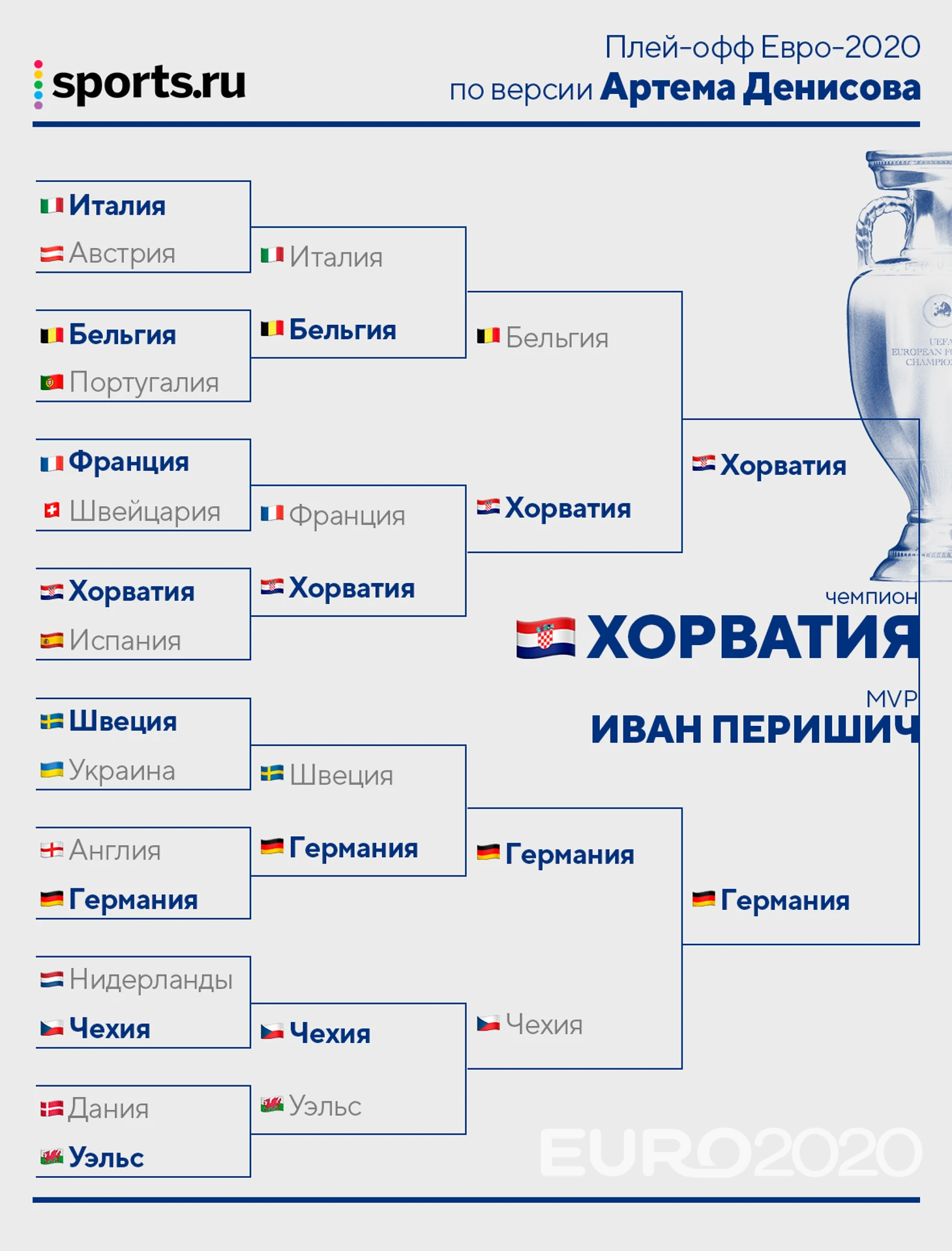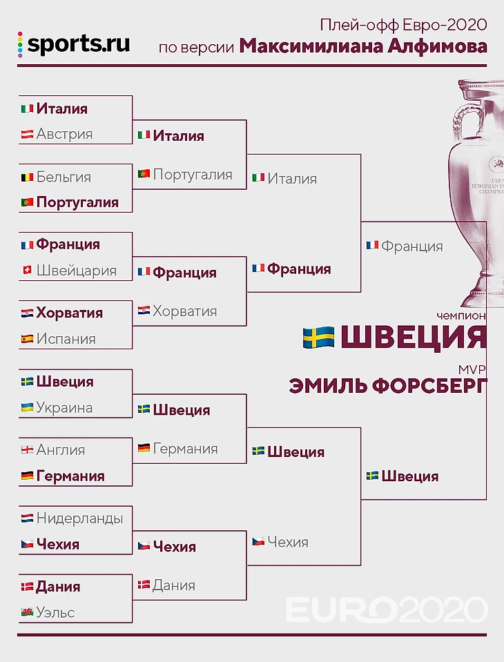 Завтра стартует плей-офф Евро-2020 – кажется, сейчас идеальный момент, чтобы угадать, чем закончится турнир. Авторы Sports.ru врываются с прогнозами сеток, а заодно выбирают чемпиона и лучшего игрока турнира.