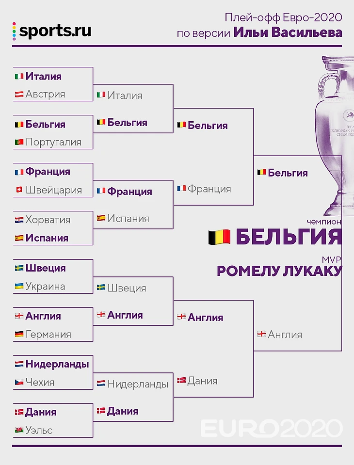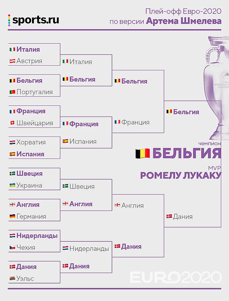 В нижней половине команда Саутгейта уверенно засушит первые два раунда, но как только в финал на «Уэмбли» поверят английские болельщики, их сборная вылетит от бешеных датчан. Очень близки реванш с Бельгией, золотая медаль на груди Эриксена и реки слез. Но это чересчур красиво для реальной жизни. Лукаку и де Брюйне снова победят.