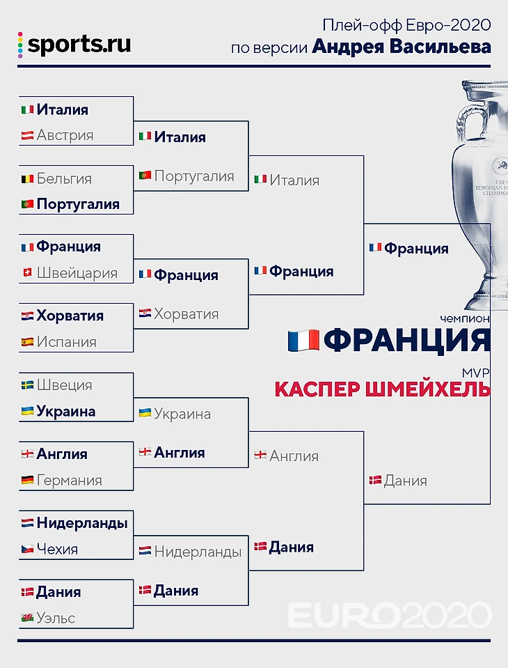 Как изучите, обязательно пишите свои варианты в комментарии. И не бойтесь экспериментов – ниже вы увидите мнения, что выиграть Евро может Швеция, а стать MVP турнира – Каспер Шмейхель.