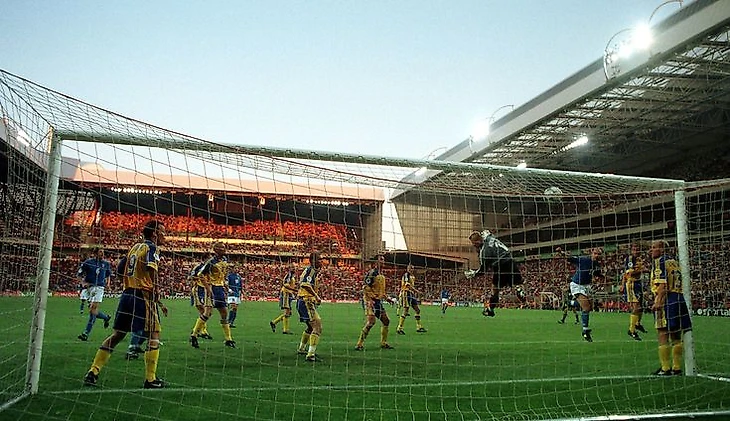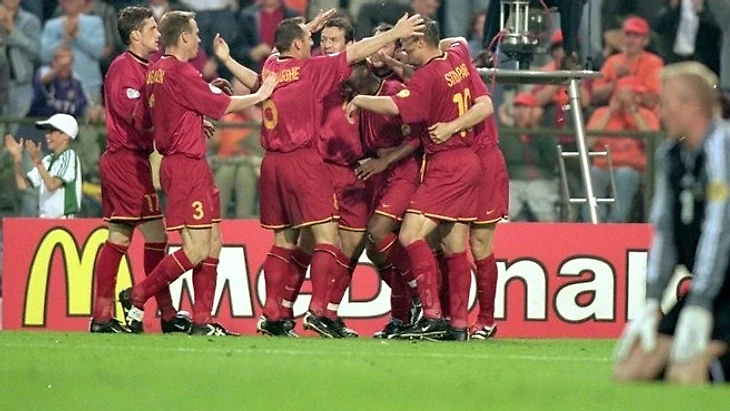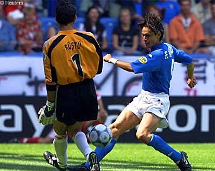 Италия-Бельгия (2-0). Матч запомнился прежде всего великолепной тактической игрой итальянцев. Встреча началась штормовой пятиминуткой итальянцев,во время которой Конте,Мальдини и дважды Индзаги могли открыть счёт,но блестяще играл Де Вильде.Однако и он был не в состоянии спасти команду,когда Тотти с близкого расстояния вколотил мяч в сетку.Этого было достаточно,чтобы вывести хозяев из шокового состояния.Подопечные Васежа так взвинтили темп,что итальянская оборона затрещала по швам,но тут во всём блеске показал себя Тольдо.Уже через три минуты после пропущенного мяча Гоор отлично пробил издали,но прекрасный сэйв Тольдо вкупе с фортуной в виде удачного отскока от крестовины позволили итальянцам сохранить ворота в неприкосновенности.Итальянцы в течении почти часа(с 7-й по 65-ю минуту) сумели провести лишь одну(!) контратаку.Кульминацией бельгийского давления стала 64-я мин.,когда Тольдо отразил опаснейший удар со штрафного Нилиса.И тут же последовала расплата за нереализованную возможность:резкий итальянский контрвыпад на 66-й мин. по сути решил исход игры.Победив в этом матче,Италия одной ногой оказалась в четвертьфинале.