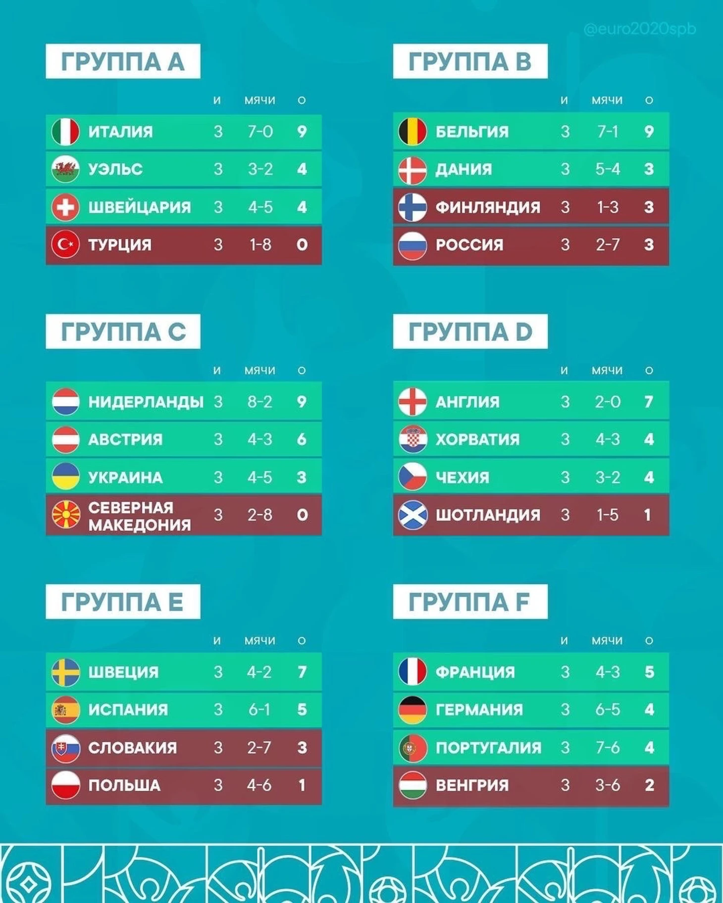 Так выглядят итоговые таблицы каждой из групп на этом ЕВРО. Кто фаворит этого Чемпионата Европы? Какие команды удивили? Что происходило в эти 13 дней? Читайте ниже.