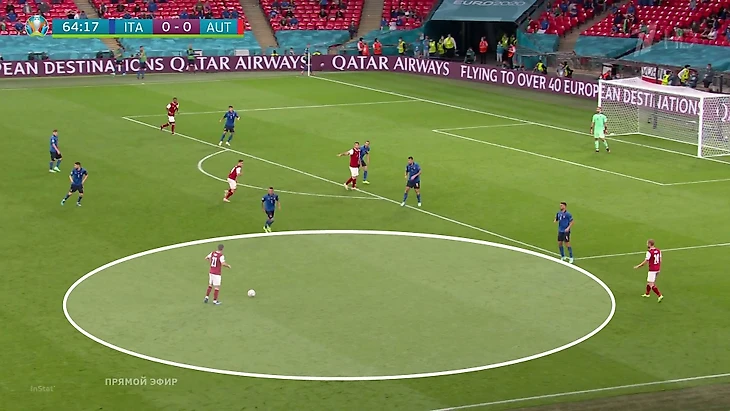 В этом примере Австрия готовит высокое давление – вся тройка полузащитников (Забитцер, Шлагер и Гриллич) смело выдвигается на чужую треть поля (в опорной никого не остается), чтобы перекрыть все варианты по центру. Ближе всех к опорной зоне вообще оказался левый вингер Баумгартнер – он готов туда бежать в случае дальнего паса, но готов накрыть и Ди Лоренцо на фланге: