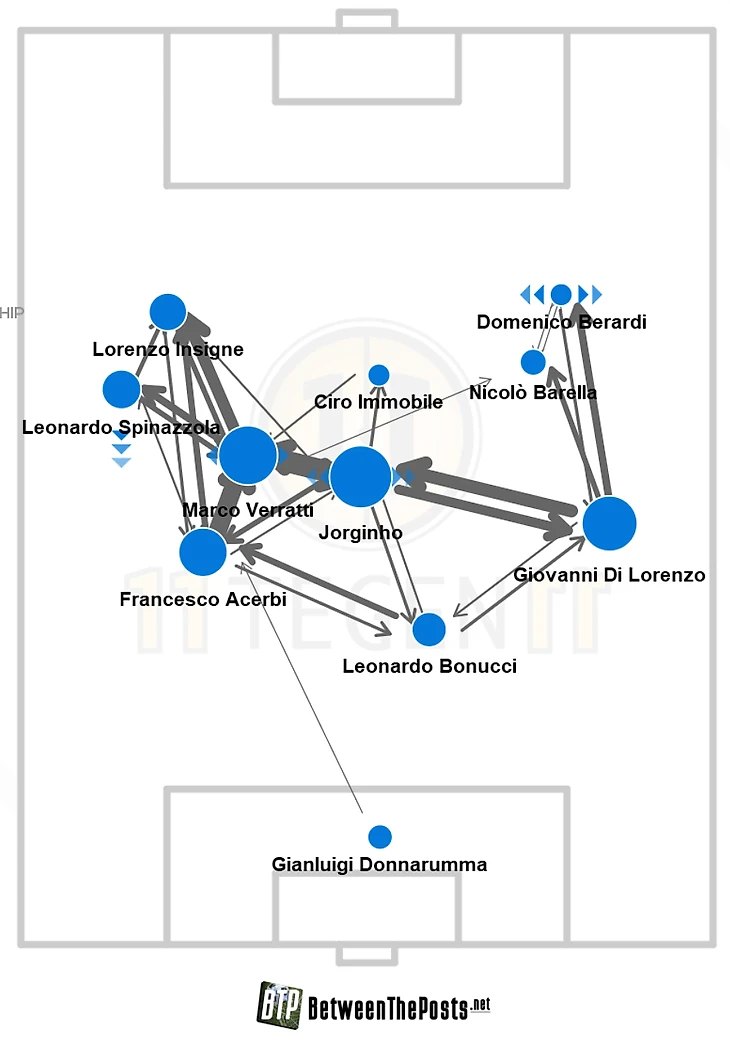 Тут Верратти оказался на позиции правого центрального в тройке и подгонял Жоржиньо открываться выше (в итоге именно через него и продвинет игру):