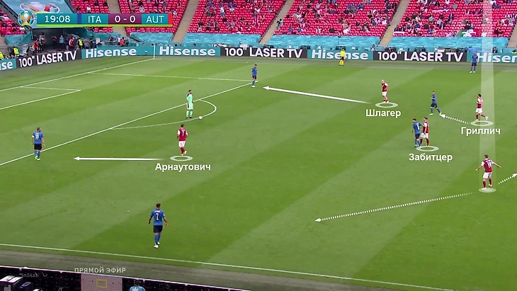 Как правило, тут возникала ситуация 5-в-4 в разных вариациях. Итальянцы отряжали в прессинг Бареллу, Инсинье, Берарди и Иммобиле – старались давить на центр и зону мяча (дальний фланг оставался свободным). У Австрии была четверка защитников и Флориан Гриллич. Команда Фоды регулярно находила свободного игрока – из-за качества игры в пас, подсказок и решений самого Гриллича. Опорник Австрии закончил с 72 точными пасами (92% точности) – больше всех в Австрии, хотя его заменили во втором экстра-тайме.