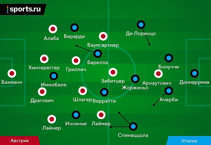 От 20 минуты до замены Марко Верратти: Италия взяла под контроль матч и ритм встречи. Это было напрямую связано с движением Верратти. Австрия вынуждена обороняться все глубже. Пускай и не допускала совсем уж явных шансов.