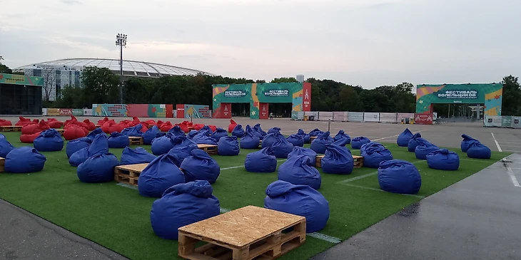 Нашел более-менее сухой мешок (перед матчем в Москве прошёл небольшой дождь), устроился, продолжаю просмотр матча. Маску стянул, т.к. вокруг абсолютно никого нет. Ближайший ко мне болельщик в 50-60 метрах от меня, тоже один в другой части зоны.