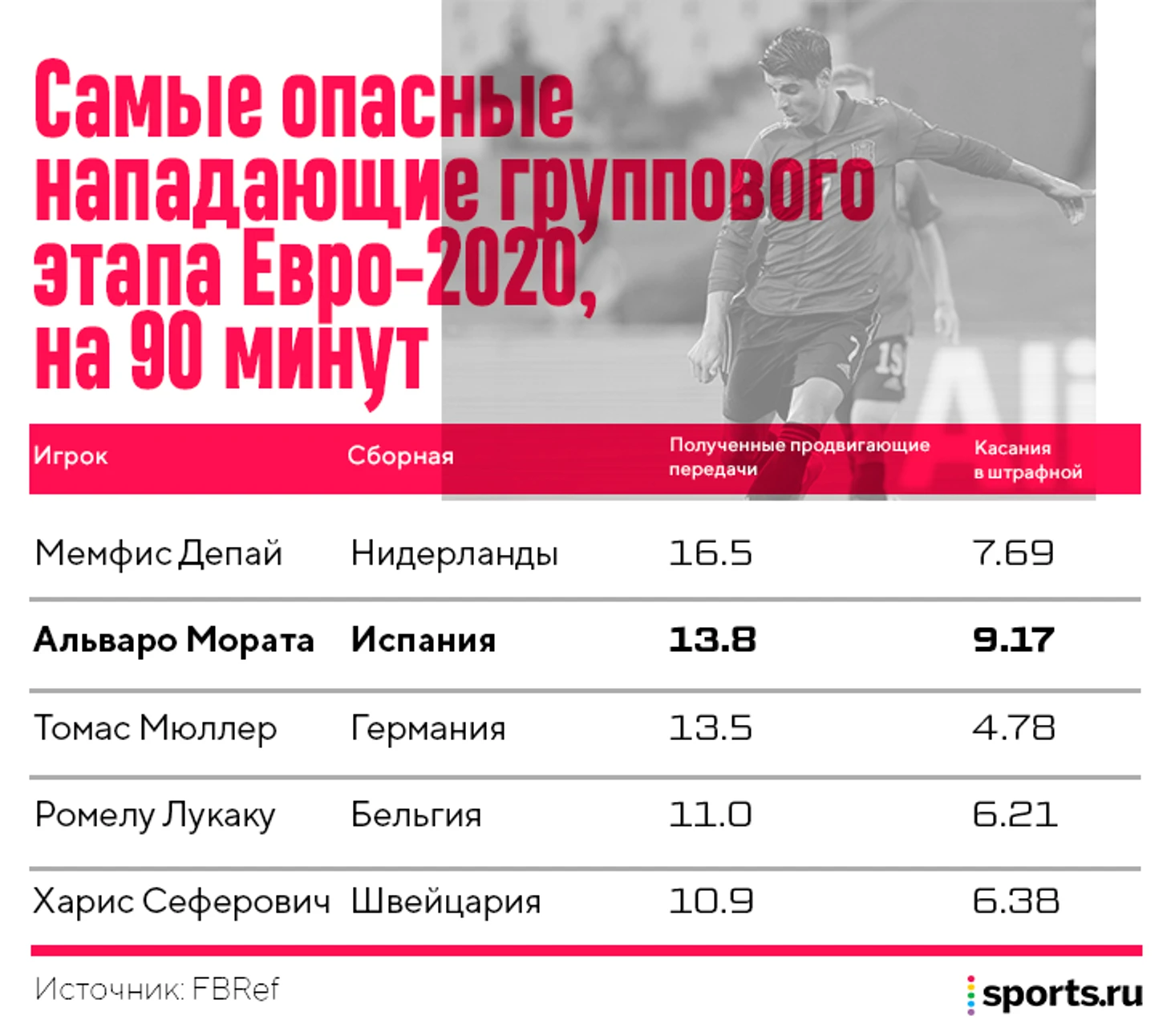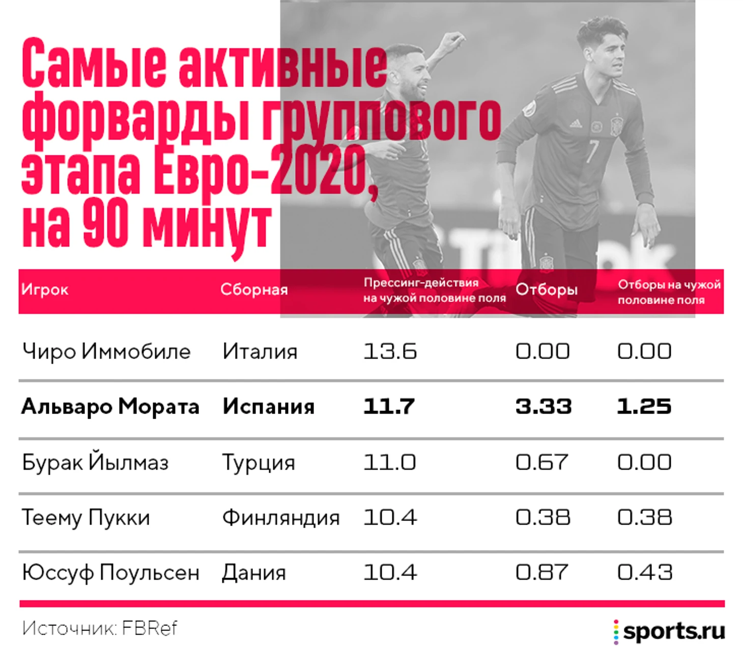 Качества Мораты критически важны для Испании. По успешности прессинга Альваро – один из лучших форвардов на групповом этапе турнира:
