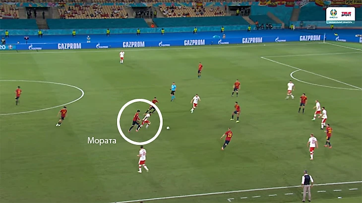 Пример из матча с Польшей. Мората опускается и начинает прессинговать даже вне родной позиции: