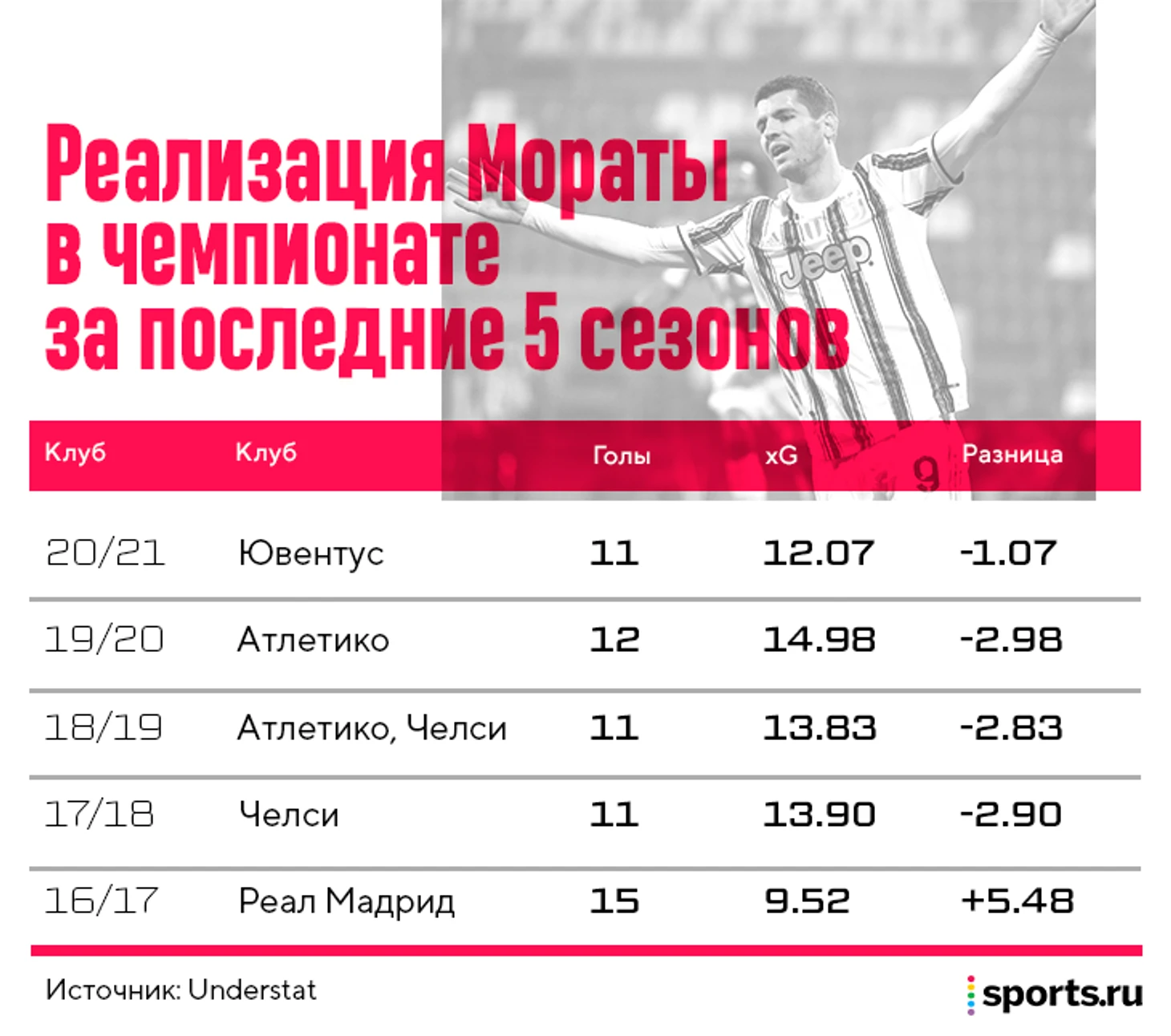 Единственное исключение – последний сезон: в «Ювентусе» Мората подстраивается под движения Роналду и из-за этого теряет в результативности. При этом в остальных случаях Альваро играл именно наконечника.