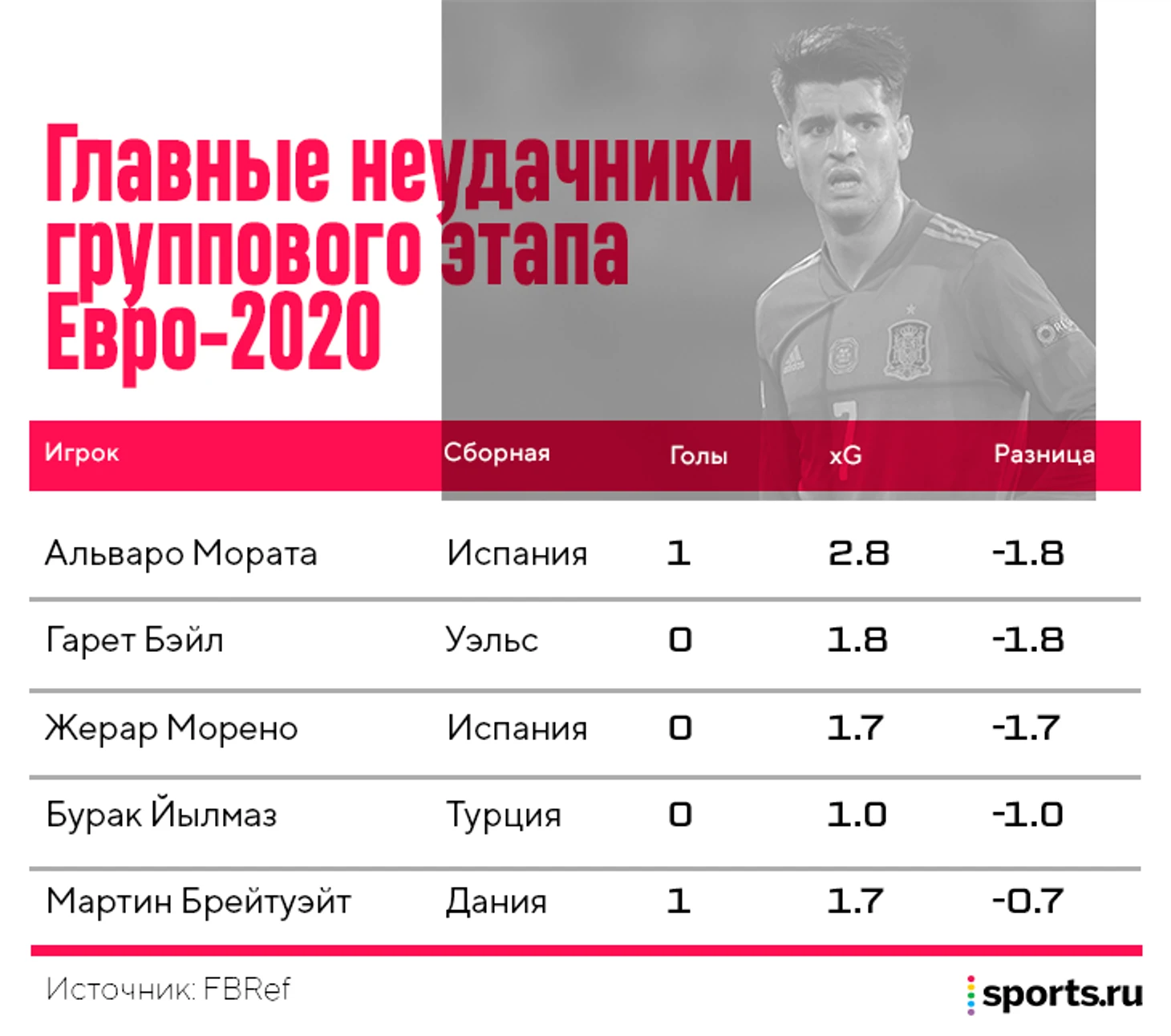Трудности с реализацией никуда не делись и на Евро. Мората – среди худших нападающих группового этапа по этому показателю:
