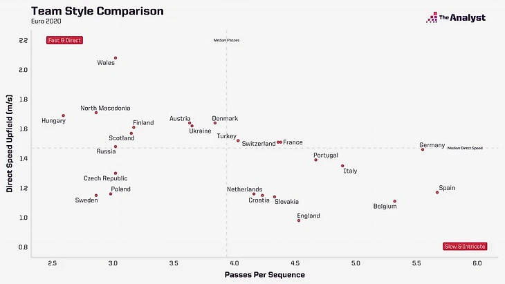 Такая размеренная манера присуща многим топ-сборным и обусловлена тем, что они в основном доминируют над соперником, взламывая автобусы, но у англичан она особенно бросается в глаза. Они будто бы даже не стремятся в атаку, совершая в среднем 4,5 паса за владение и продвигаясь при этом вперед со скоростью 1 м/c. При розыгрыше мяча лишь в 17% случаях они двигают его вперед. Немцы еще больше дорожат мячом (в среднем 5,6 передач за владение), но чуть резвее идут в атаку.