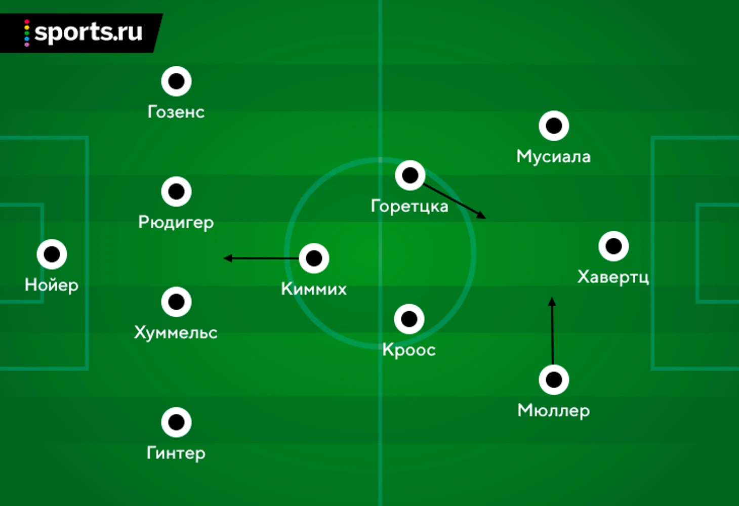 Перевод Киммиха в опорную зону позволит Гюндогану (или Горетцке), который образует сдвоенный центр с Кроосом, активнее подключаться к атакам и бить по воротам. Леон может стать человеком, который свяжет тройку нападения с остальной командой (часто случается, что форварды играют сами по себе), и будет снабжать мячами Хавертца и Мюллера, а немцам больше не придется использовать навал как единственный способ против перегруженной обороны.