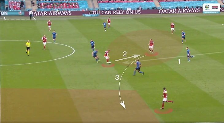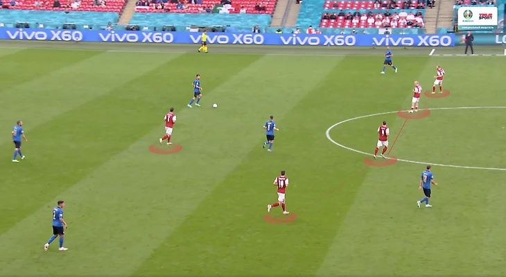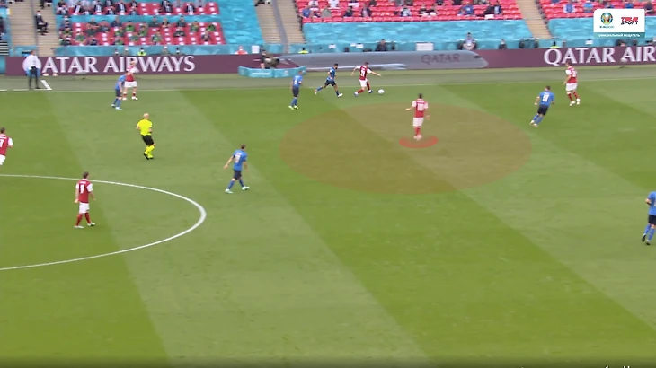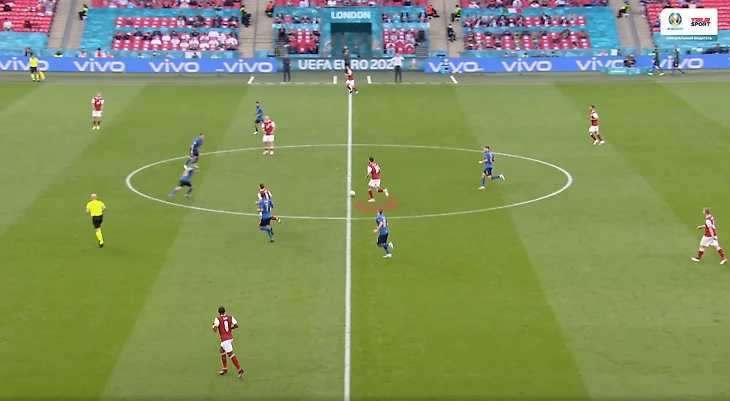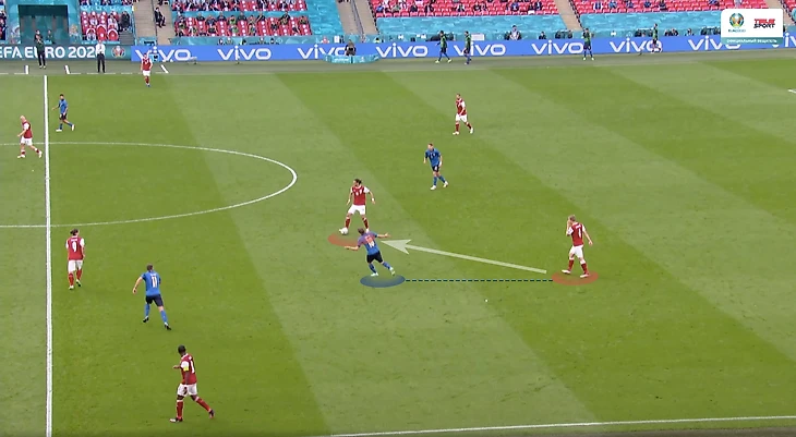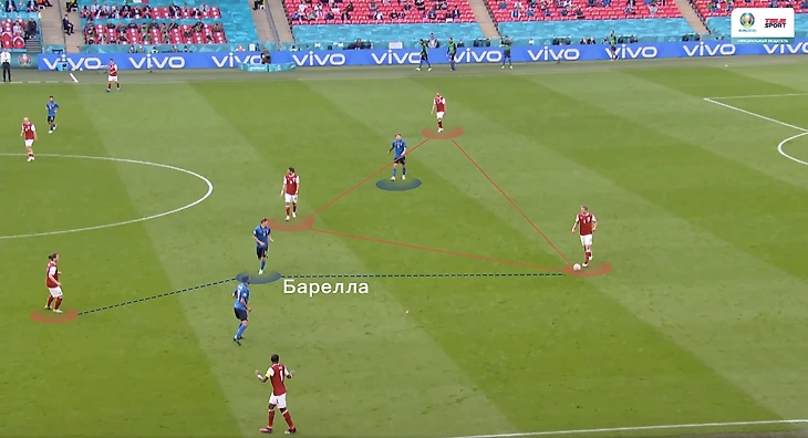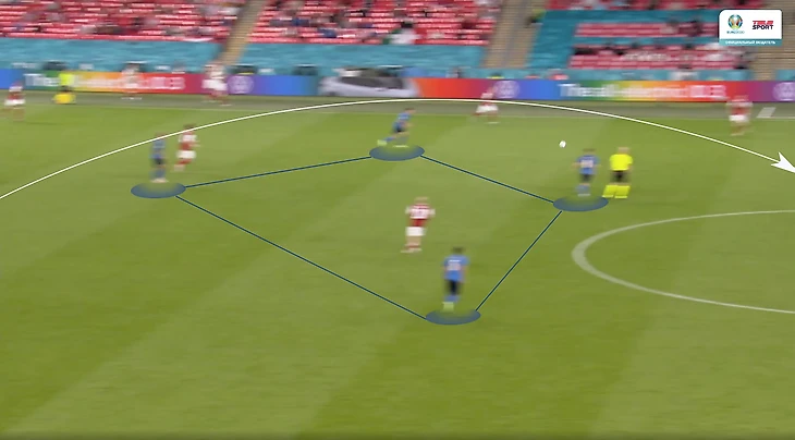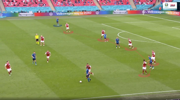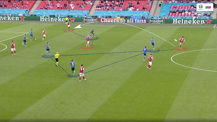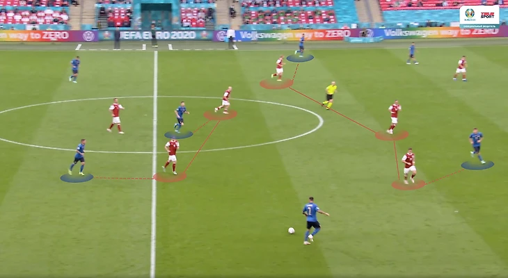 Вернемся к первому тайму. На его экваторе итальянцам все же удалось забрать мяч, во многом благодаря индивидуальным навыкам. Верратти и Жоржиньо на высочайшем уровне умеют сохранять мяч под давлением и находят свободное пространство практически в любой ситуации на поле. Именно благодаря контролю мяча от этой пары итальянцам удалось вернуть себе мяч и перейти на более рискованную структуру билдапа. Если обычно схему начала атаки от сборной Италии можно представить как 3-2(1), то в этом матче часто можно было увидеть что-то похожее на 1-4: