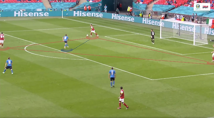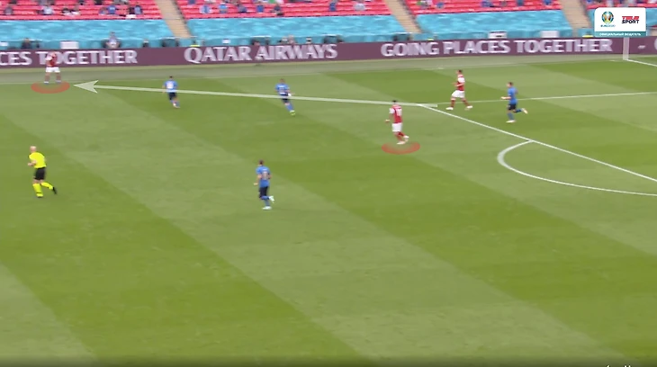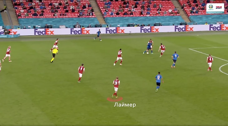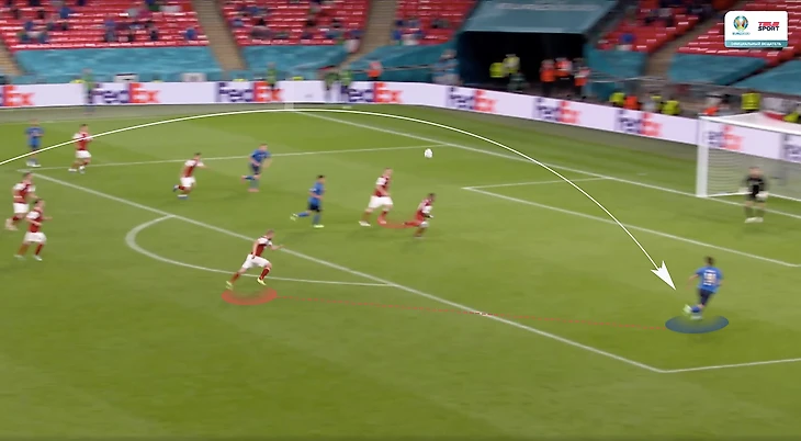 Тут особенно интересна роль крайних полузащитников гостей, в частности, Лаймера. Его смещения пятым защитником – очень важная подстройка под итальянцев, так как команда Манчини любит нагружать последнюю линию соперника большим количеством игроков (пять вертикальных каналов практически всегда заполняются). Выше рассмотрены примеры, как австрийцы контролировали ширину и не позволяли сопернику перегружать их линию обороны. Теперь перенесемся в первый дополнительный тайм. Перед разбором ключевого гола в этой встрече добавим контекста, а именно – обсудим важность тренерских перестановок. Еще в середине второго тайма Манчини поменял Верратти на Локателли. Это первая важная деталь, так как Мануэль является более "вертикальным" игроком, нежели Марко (он делает меньше касаний и чаще предпочтет рискнуть, вскрыв блок соперника передачей между линий). Вторая деталь – выход Кьезы. Федерико не блистает в ограниченных пространствах и позиционных атаках, но на пространстве, благодаря своим скоростным данным, чувствует себя как рыба в воде. Третий момент – Лаймера, который отбегал по всей бровки 90+ минут, переместили на противоположный фланг, как раз под свежего Кьезу. Все эти детали в совокупности вылились в забитый мяч:
