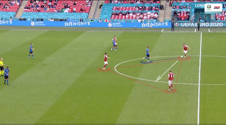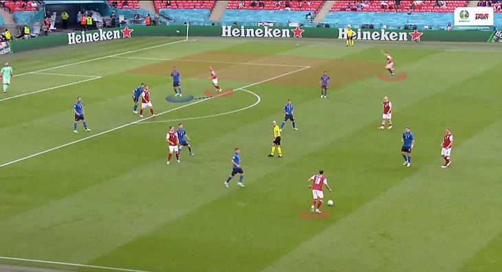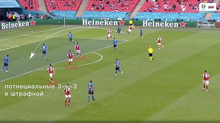 Отсюда следует третий пункт. Свобода крайних защитников сборной Австрии. Блок 4-3-3 от хозяев сосредоточен на контроле центральной оси, поэтому Инсинье и Берарди при обороне занимают смежные узкие позиции. Это позволяет им и контролировать линии передач в полуфланги, а при надобности выдвигаться на крайних защитников соперника. Конечно, накрыть фулбека противника сразу практически невозможно, так как между игроками есть зазор. Ситуацию для вингеров гостей усугубляло отлаженное начало австрийских атак.