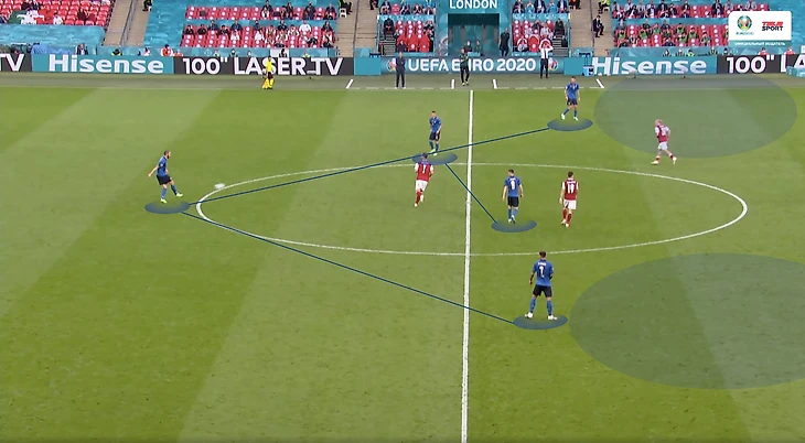Второе. Свобода опорного полузащитника. В схеме 4-3-3 при обороне, которую использует сборная Италии, нет игрока, контролирующего опорную зону соперника, и этот факт облегчал владение гостей:
