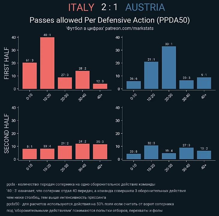 Благодаря всем этим деталям гости уверенно контролировали мяч и ход игры первую половину первого тайма. Однако к опасным моментам это не приводило. Тренерский штаб сборной Италии уже во втором тайме сумел подстроить игру без мяча под соперника. Для наглядности изменения можно сравнить два розыгрыша мяча от ворот сборной Австрии. В первом тайме: