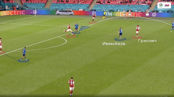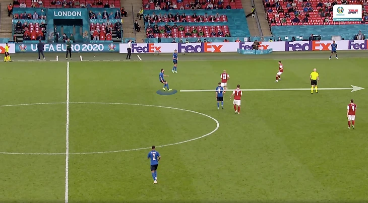 Первые две проблемы итальянцы пытались решить одинаково. На свободных игроков, будь то центральный защитник или опорник, выдвигались восьмерки гостей. Но полузащитникам приходилось покрывать слишком большие расстояния, поэтому пользы это приносило немного. Часто свободу получали сразу два игрока австрийцев – центральный защитник и опорник. Обе восьмерки не могли высоко выдвигаться в давление и оставлять в центре поля одного Жоржиньо, а Иммобиле был пассивен без мяча и перекрывал только линию паса на дальнего защитника. Все эти факторы приводили к подобным ситуациям:
