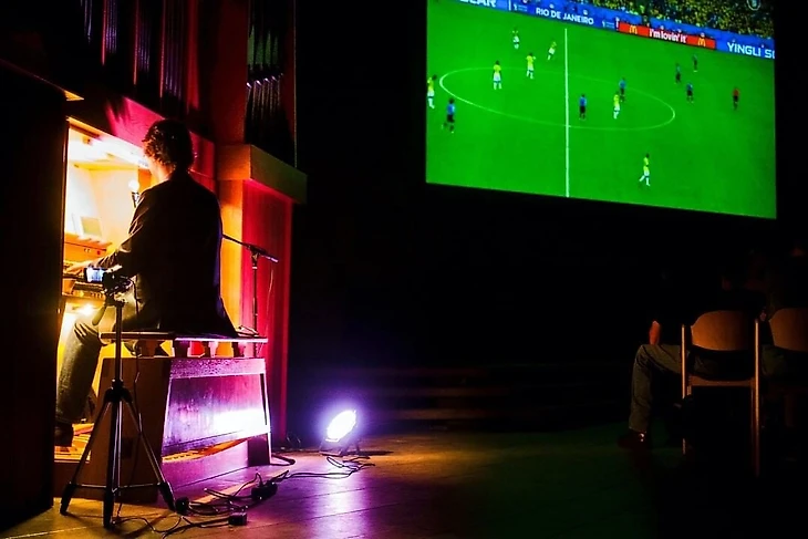 Органиста зовут Штефан фон Ботмер. Играя, он подстраивается под ход матча.