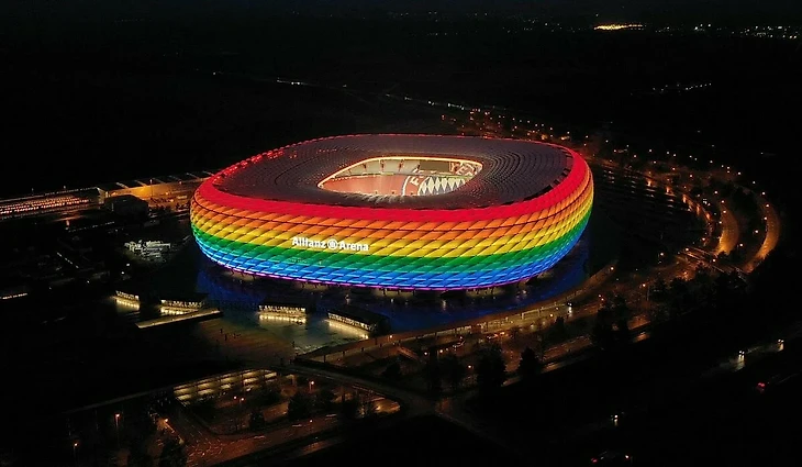 В ответ на это Германия хотела , чтобы подцветка Мюнхен Арены ( где и прошёл матч Германия - Венгрия ) носила "радужный характер" , то есть была окрашена в цвет ЛГБТ флага , но УЕФА отказала в провидении такой акции ( всё-таки футбол вне политики бла-бла ) .