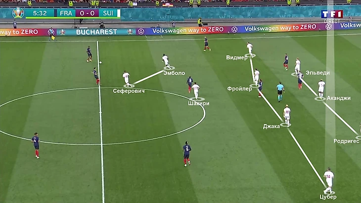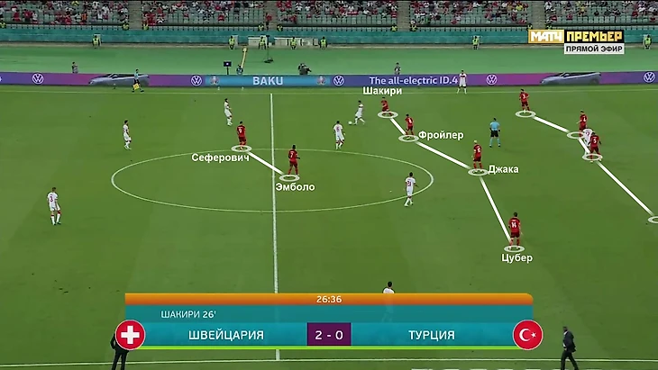 Более интересная динамика наблюдается в атаке. Швейцария делает упор именно на зону Цубера. На противоположном краю выходит оборонительный Сильван Видмер (по ходу турнира он выжал из основы более дерзкого Кевина Мбабу) – этот фланг балансирует смелое сочетание на противоположном краю. Цубер занимает намного более высокую позицию, а Рикардо Родригес поддерживает его резкими рывками из центра защиты.