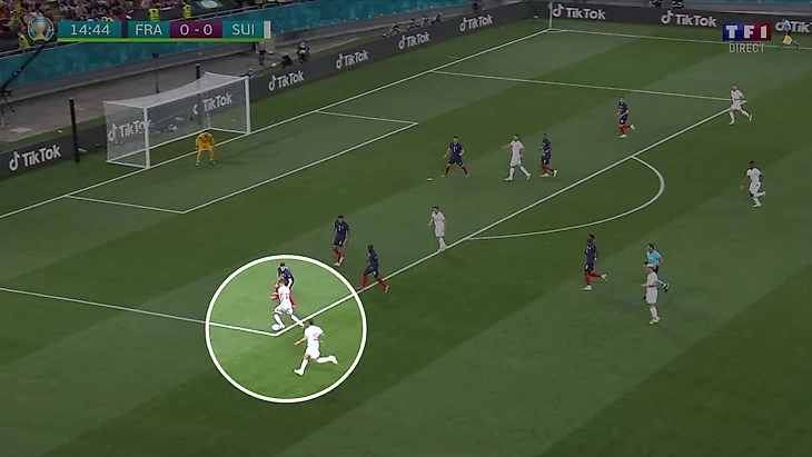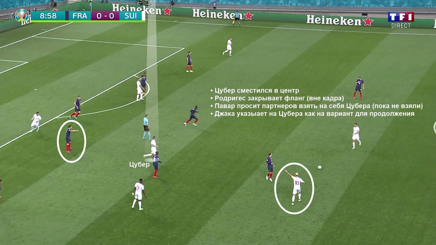 Именно на это взаимодействие соперника бывает трудно среагировать. Помогает и тот факт, что Гранит Джака (главный в команде по продвигающим передачам) играет ближе к этому краю. За счет этого Швейцария действительно классно нагружает соперника в этой зоне, а описанные роли удобны качествам этого треугольника (Джака – продвижение, Родригес – отвлекающие подключения, Цубер – адаптация под позиции партнеров и создание угрозы).