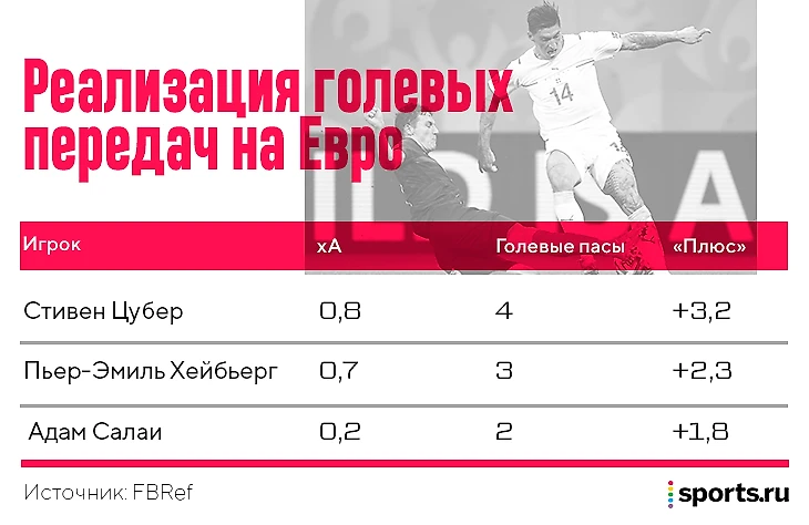 Своим временем на Евро Цубер распорядился максимально качественно, но все-таки статус лучшего ассистента турнира ему льстит. Реализация партнеров сильно помогла – 4 ассиста родились из 0,8 xA. Это самый большой «плюс» турнира:
