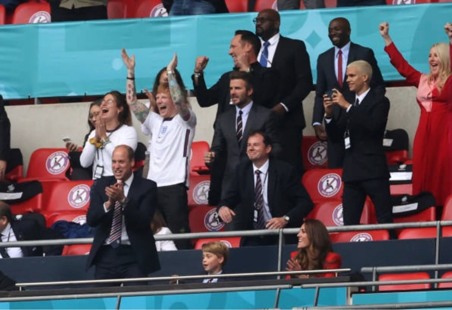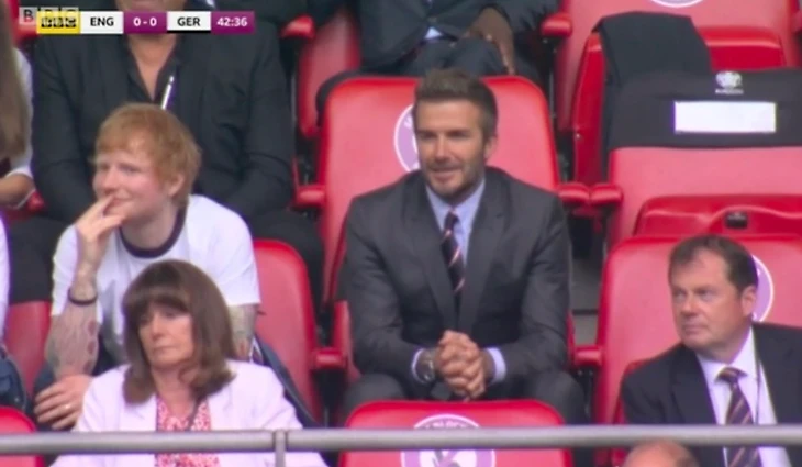 Но больше всего внимания привлекли знаменитости, которые сидели повыше, а именно — экс-капитан сборной Англии Дэвид Бекхэм и его внезапный сосед — певец Эд Ширан.