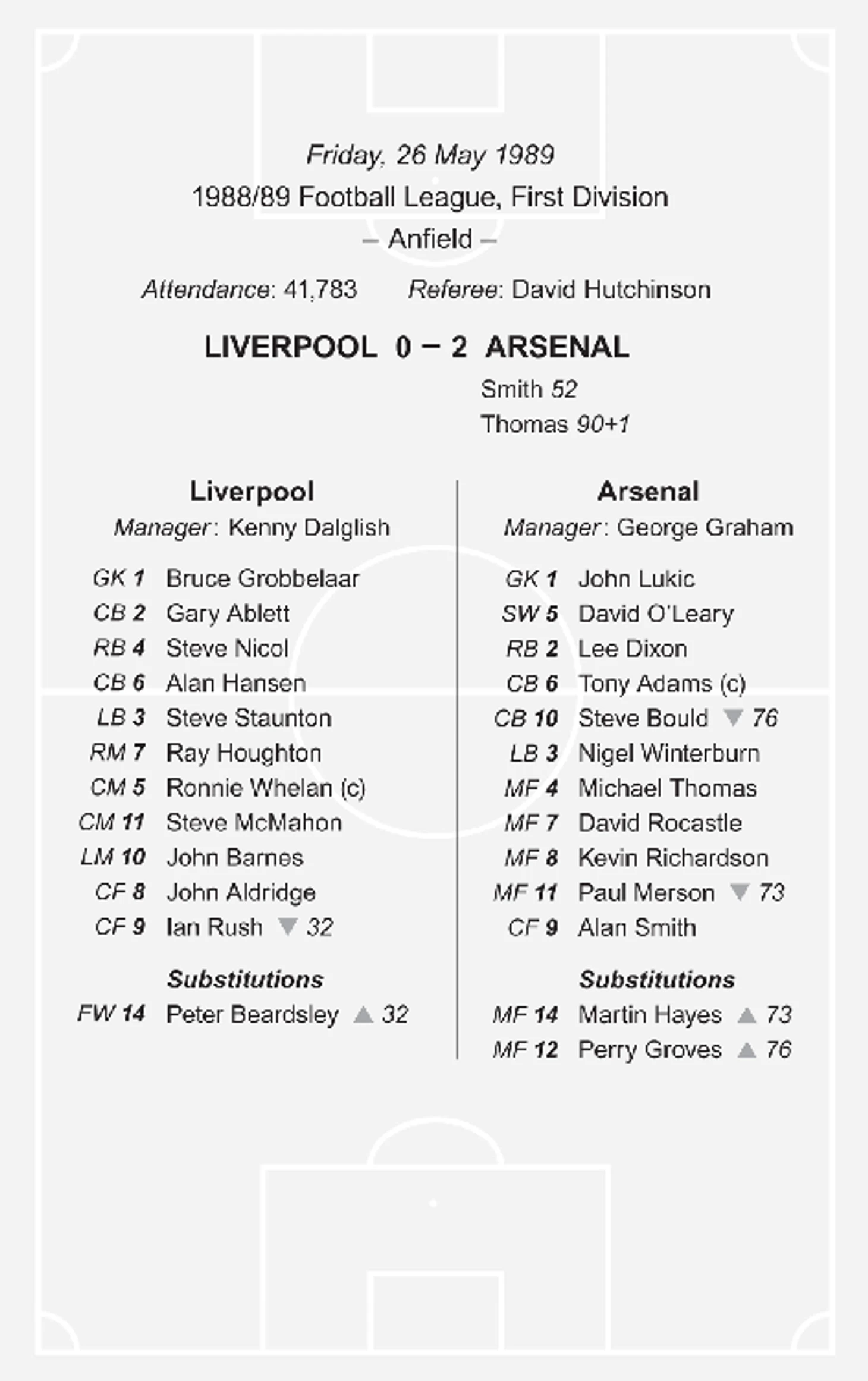 Это был еще один шотландец, чьи два титула за три года пришли, когда команда Далглиша была на пике своего развития, и который внес первый значительный вклад в то, что «Ливерпулю» пришлось ждать тридцать лет, чтобы вернуться на вершину английского футбола. Это был Джордж Грэм. А командой был «Арсенал». И величайшая игра в истории Канониров, самая зрелищная кульминация любого сезона лиги, состоялась на «Энфилде» вечером в пятницу, 26 мая 1989 года.