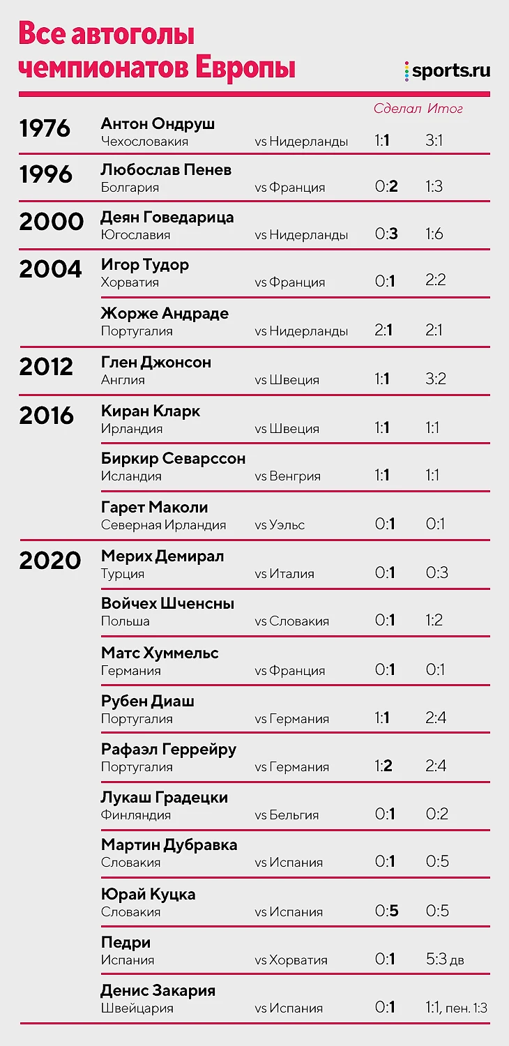 Еще из невероятного: четыре подряд последних автогола случились в матчах сборной Испании. Еще в группе самый нелепый себе закинул словацкий вратарь Дубравка, потом добавил к своему разгрому Юрай Куцка, в 1/8 финала в свои забил Педри (единственный эпизод против испанцев), теперь Закария снова Испании помог.