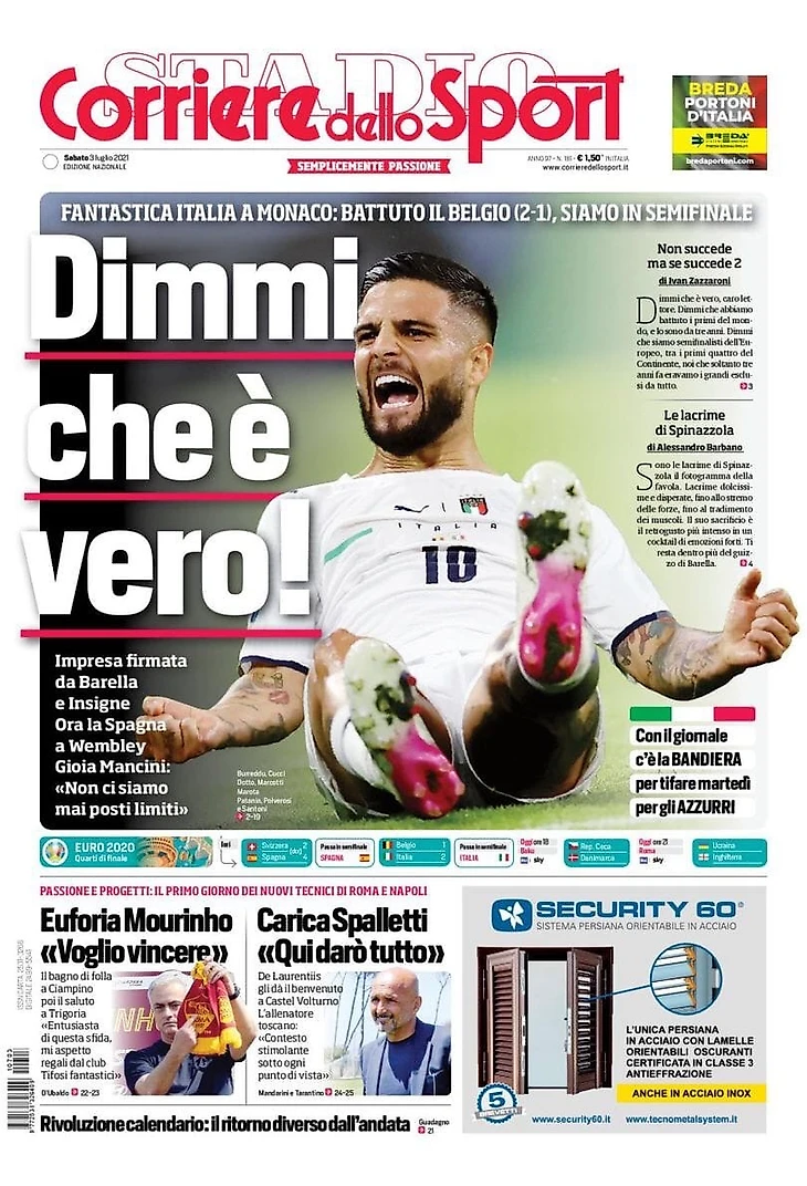 Бельгия побеждена, мы снова среди грандов футбола. Во вторник на «Уэмбли» полуфинал с Испанией. Битва в Мюнхене, Адзурри сногсшибательны. Волшебство Бареллы и Инсинье, превосходный Джиджо, монструозный Кьеллини, капитуляция Лукаку. Драма Спинаццолы: слёзы и конец турнира.
