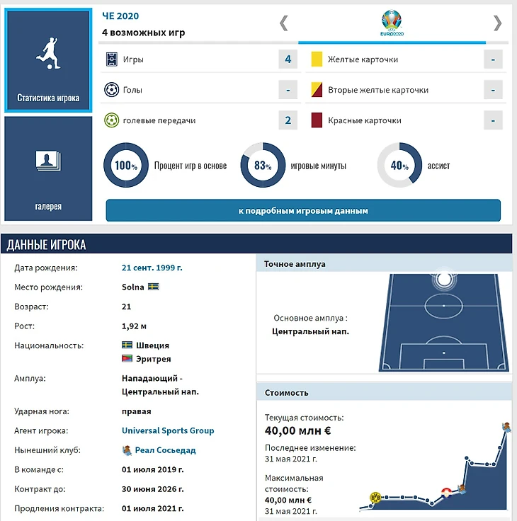 Я этого футболиста увидел в первые, не давно на матчи Евро - 2020. Сборная «Швеции» играла против сборной Словакии матч закончился со счетом 1:0 в пользу Шведской сборной. До чемпионата Европы мне не был знаком этот молодой футболист. Я о нем вообще ничего не знал, и никогда не смотрел матчи с его участием кроме той самой игры Евро - 2020. Мне очень понравился это игрок, своей классной игрой, особенно владением дриблинга, классный техничный игрок. Ну я посмотрел только один матч с его участием, и то меньше пол тайма. Что-бы сделать анализ или разбор по этому футболисту, надо посмотреть по больше матчей с его участием, тогда в голове будет рисунок его игры, и я смогу на много больше написать вам, об этом молодом игроке. Поэтому мне надо время, его изучить, и после я продолжу про него писать. Продолжение будет уже скоро. 👇