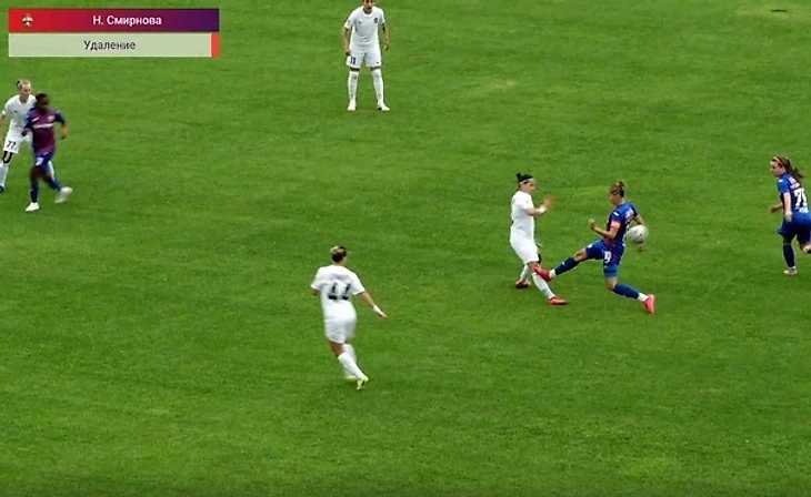 Добавьте сюда проблемы с дисциплиной - и все станет совсем печально. В прошлом туре в Перми на исходе часа игры удаление заработала Анастасия Поздеева. В этом, 13-м, еще в первом тайме прямую красную "схлопотала" капитан, Надежда Смирнова. После такого фото сомнений в верности решения арбитра не возникает: