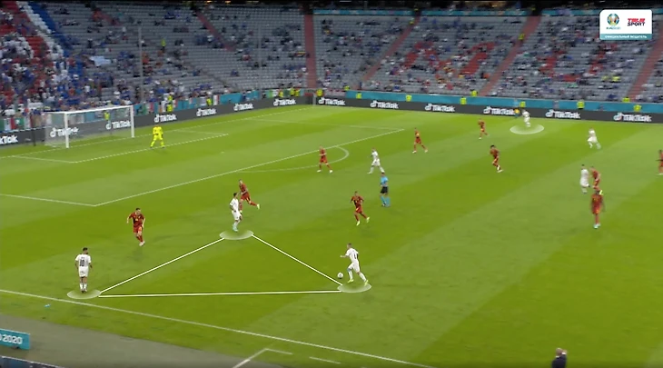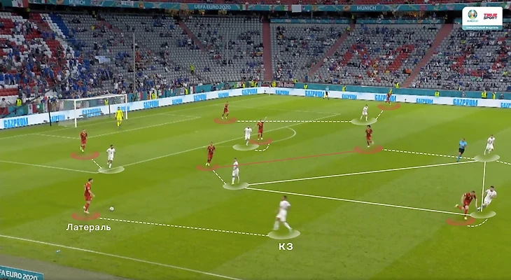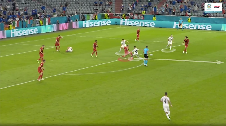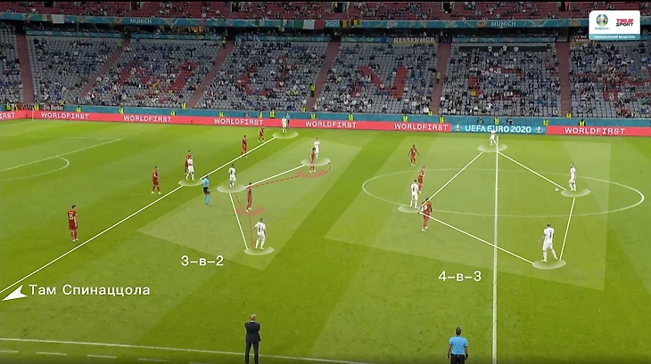 Спинаццола идёт широко во фланг, а Инсинье смещается в центр и перегружает зону. Итальянцы получают численное большинство во всех важных зонах