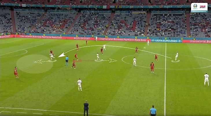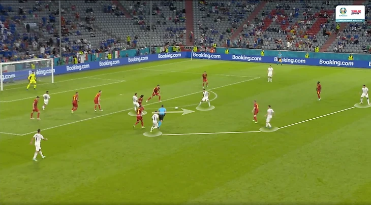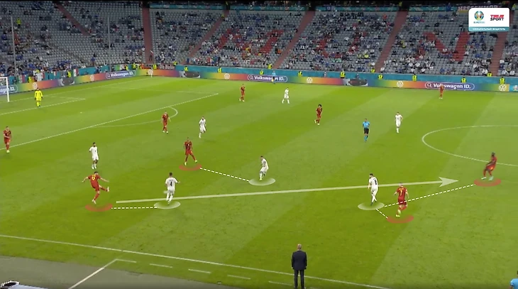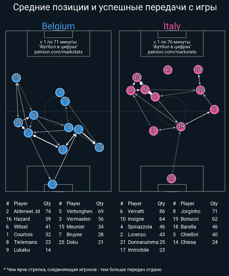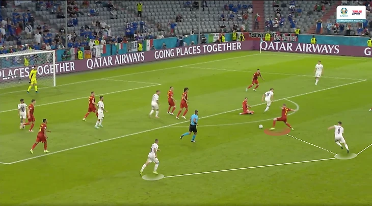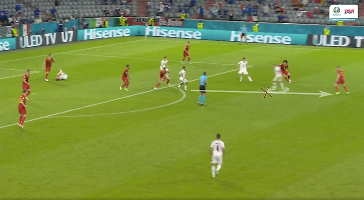 Если возвращаться к матчу, то во втором тайме Роберто Мартинес сделал несколько важных перестановок, которые положительно сказались на ходе матча. Дока стал опускаться ниже, часто меняя схему на 5-3-2. Это позволило лучше контролировать проблемные полуфланги, где у Италии в первом тайме было слишком много свободы. Торган Азар стал чаще высоко подниматься в прессинг на крайнего защитника, оставляя в обороне четверку защитников (в конце тайма бельгийцы полноценно перешли на нее). Выход Мертенса позволил перегружать опорную зону итальянцев уже двумя игроками. В первом тайме этого не хватало, там открывался только де Брейне, по которому плотно отыгрывал Жоржиньо, не боясь оставить свободную зону.