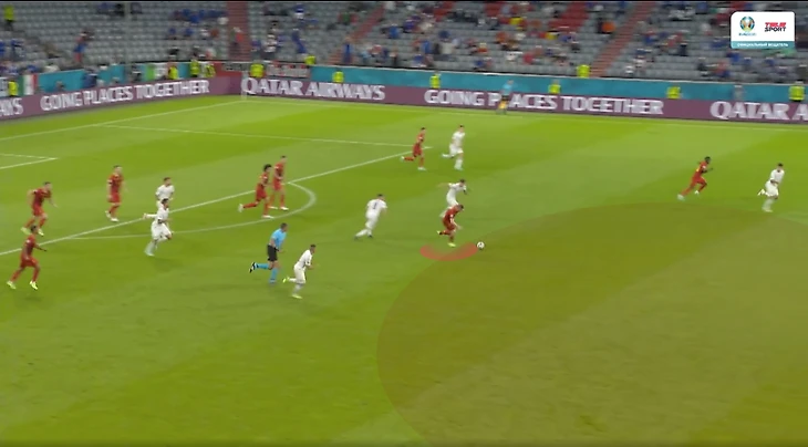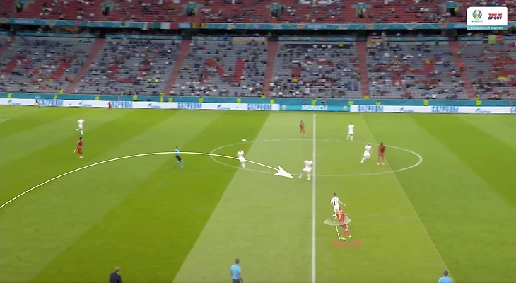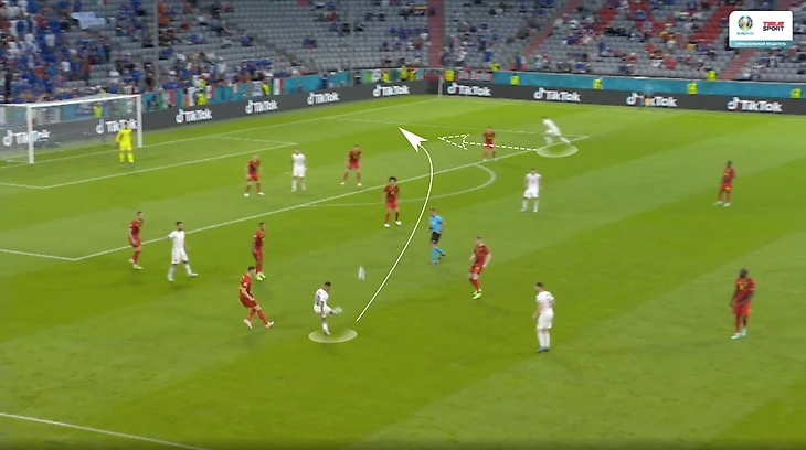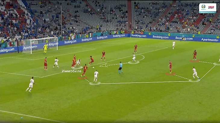 Идея Манчини заключалась в заполнении и перегрузе свободной зоны, в которую не садится Лукаку (выше отмечено, почему именно). После было несколько вариантов развития событий: короткий розыгрыш внутри образовавшегося в зоне треугольника/ромба с проникновением в штрафную, вывод на ударную позицию Инсинье (уже много раз отмечались его фирменные удары из этой зоны, второй гол – ярчайший пример) или переводы на вбегающего в штрафную на дальнем фланге Кьезу.