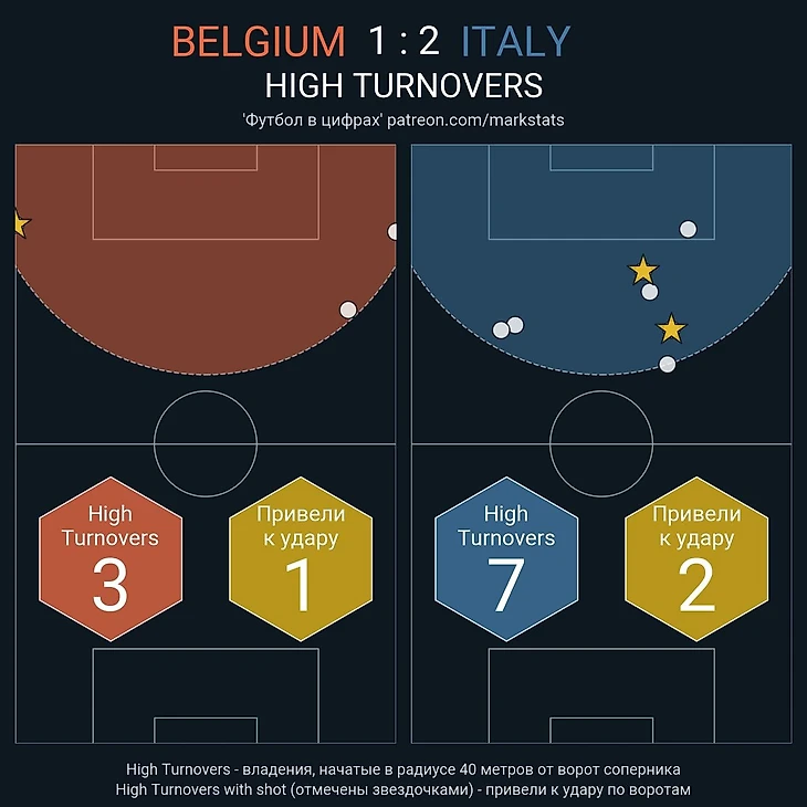 Аналогично можно рассмотреть и полезность контрпрессинга, сравнив успешный и неудачный возврат мяча. Но сначала рассмотрим систему подстраховок от сборной Италии при владении на чужой трети поля: