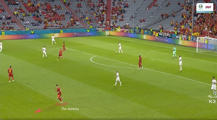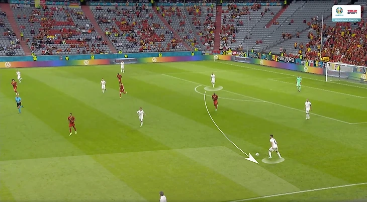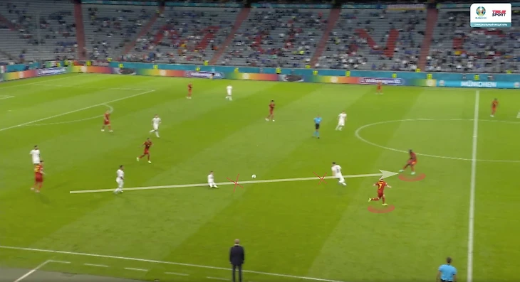 Теперь рассмотрим неудачный пример прессинга, который привел к опасному выпаду бельгийцев: